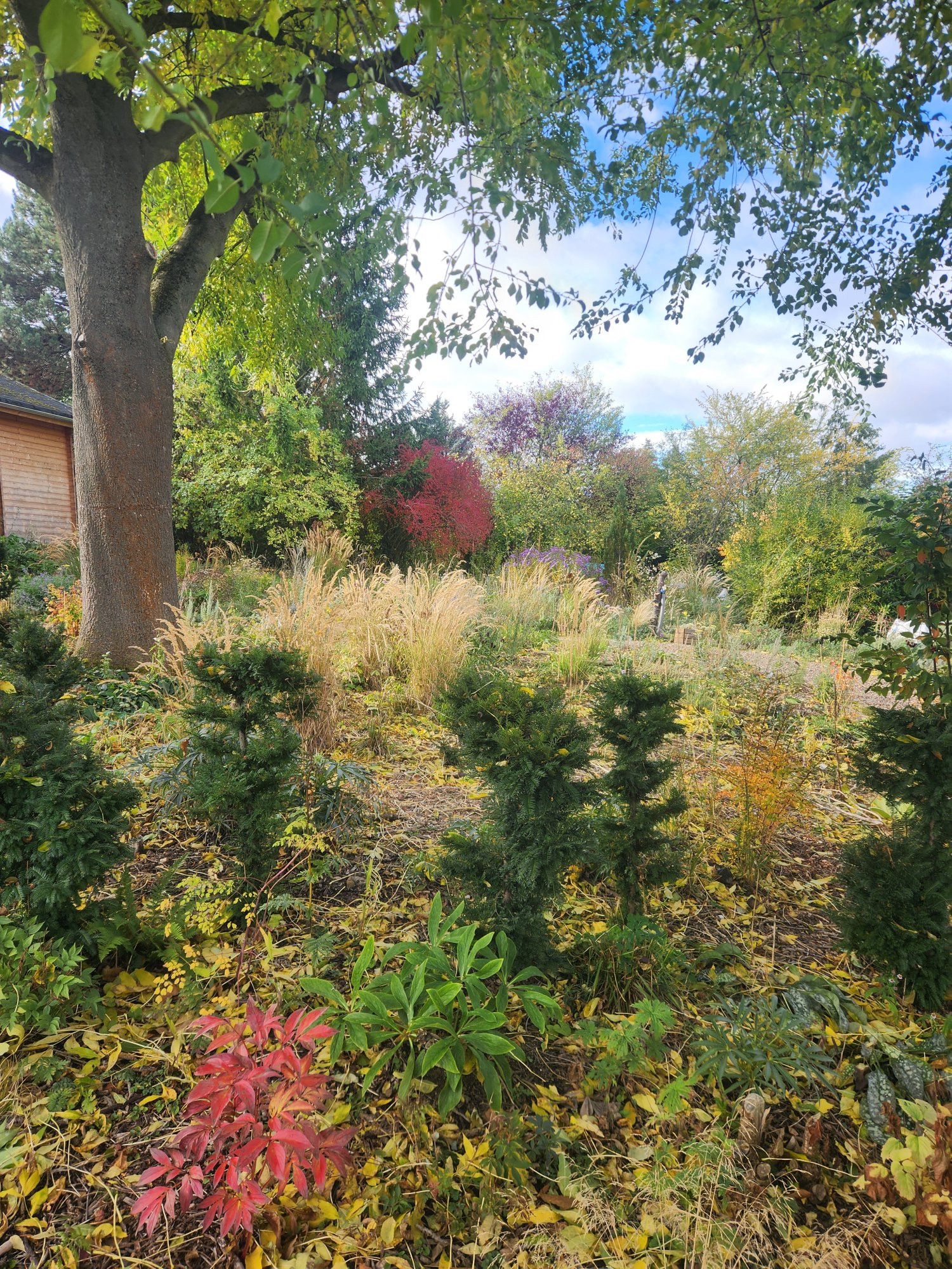 Bei mir sieht es zur Zeit so aus. Die Eiben haben gut bestockt, spätestens übernächstes Jahr dürfte meine Dominoreihe auch als solches erkennbar sein. Im Vordergrund der Pfingstrosensämling zeigt ne tolle Herbstfärbung , ich bin auf Blüten gespannt.