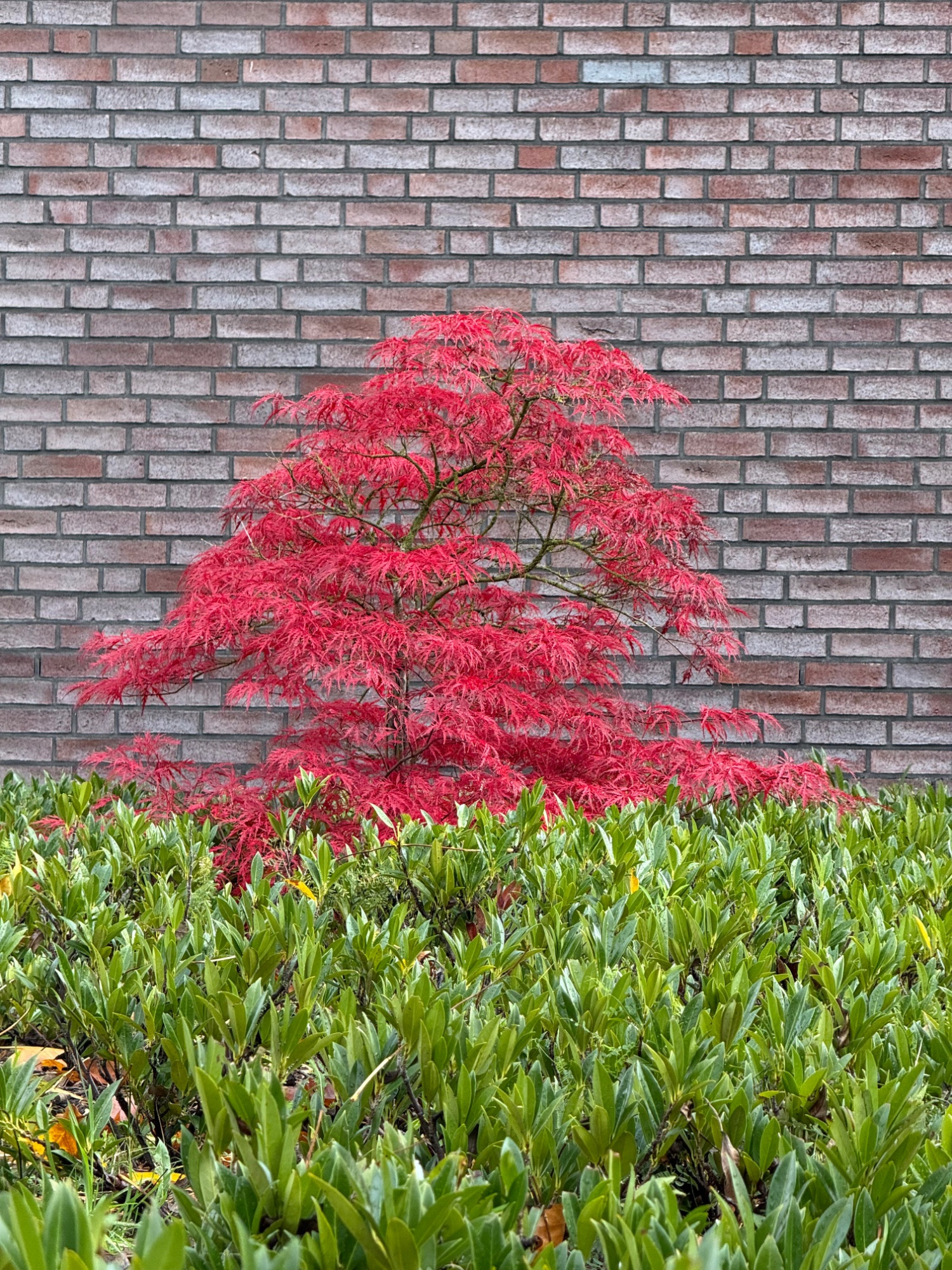 So leuchtet der hiesige Bloodgood nur wenn´s im Herbst mehr Sonnentage gibt als in diesem Jahr. Daß er das dann grundsätzlich kann zeigt dieses Foto aus dem Spätherbst 2021 (da war er noch klein und niedlich, inzwischen ist der schmale Weg davor komplett versperrt):