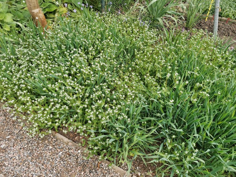 Ich hatte Ende September die Sämaschine in einen anderen Garten fahren müssen und unterwegs die Säklappe für ein paar Meter geöffnet. Das ist ein schöner Streifen im Splitt geworden, allerdings ohne Nährstoffe doch nur sehr wenig entwickelt.
