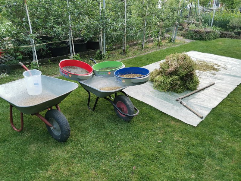 Die Tage war es dann soweit, die Samen sind ausreichend abgereift und es fing schon an mit ausfallen. Deshalb den Feldsalat runter vom Beet, in Schubkarren nachreifen lassen. Gestern das erste mal gedroschen. Sind schon wieder 2 Liter Saatgut. Das wird für viel Begrünung reichen.