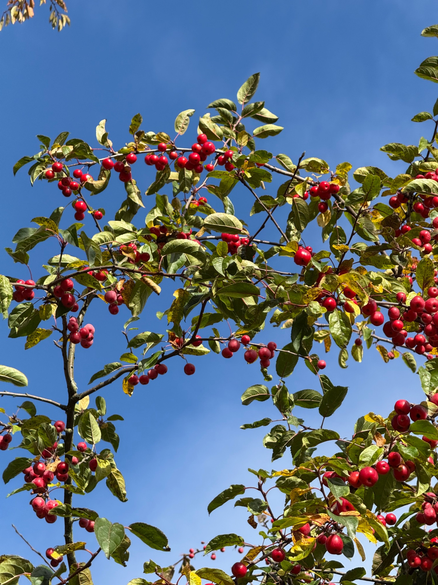 Malus Evereste hat an sonnigem Stand sogar ein wenig Herbstfärbung was schön kontrastiert mit ihren Äpfelchen, bei Red Sentinel sind die meisten Blätter eher noch grün: