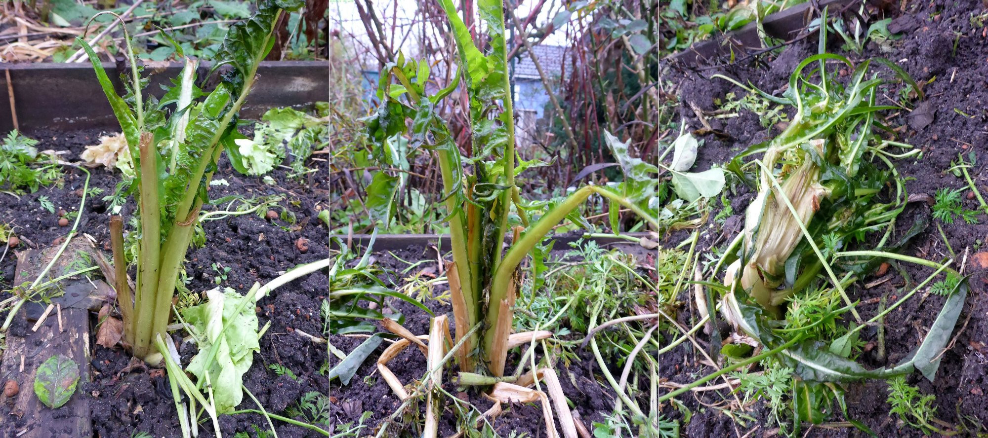 Die ebenfalls engst verwandte "Endivien-Zicchorie" (cicchoria endivia) war bislang DER Massebringer in meiner Herbstsalate-Kollektion: Diese (angeblich robusteren) glatten (Eskariol-) Endivien (Sorte 'Breadblad') waren an der Grenze: Unabgedeckt teilweise geschrottet, aber abgedeckt durchweg (und ohne sichtbare Schäden) überlebt. ABER die wenigen verbliebenen (und angeblich deutlich empfindlicheren) Frisée-Endivien (also die gekrausten) haben die Sache mit gesicherten -5° (was ja angeblich die Grenze für die wie gesagt robusteren glatten Sorten sein soll) ebenso und unabgedeckt überstanden!! - Gibt's dazu ergänzende Erfahrungen in anderen Gegenden / mit anderen Temperaturen?