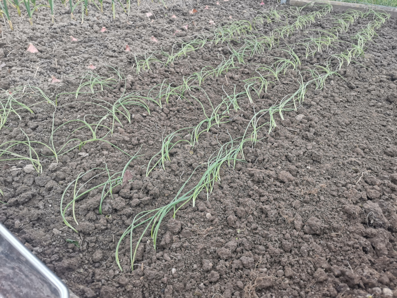 Ich grabe den Strang mal wieder aus, die Saison fängt ja gerade an. Wenn ich Zwiebeln nicht mit Steckzwiebeln mache, sondern säe, ziehe ich sie vor, weil die Jugendentwicklung so langsam ist. Durch die Voranzucht und pflanzen haben sie so weniger Unkrautdruck. Ich habe 2 Korn pro Topf in eine Multitopfplatte gesät. Nach 6 Wochen waren sie soweit zum auspflanzen. Also erstmal aus den Töpfen holen, bequem im sitzen im Schatten. Hier hat sich ein Bleistift bewährt, der unten durch das Loch der Zellen gedrückt den Topfballen raushebt. Pflanzen erstmal in einer Schale sammeln.