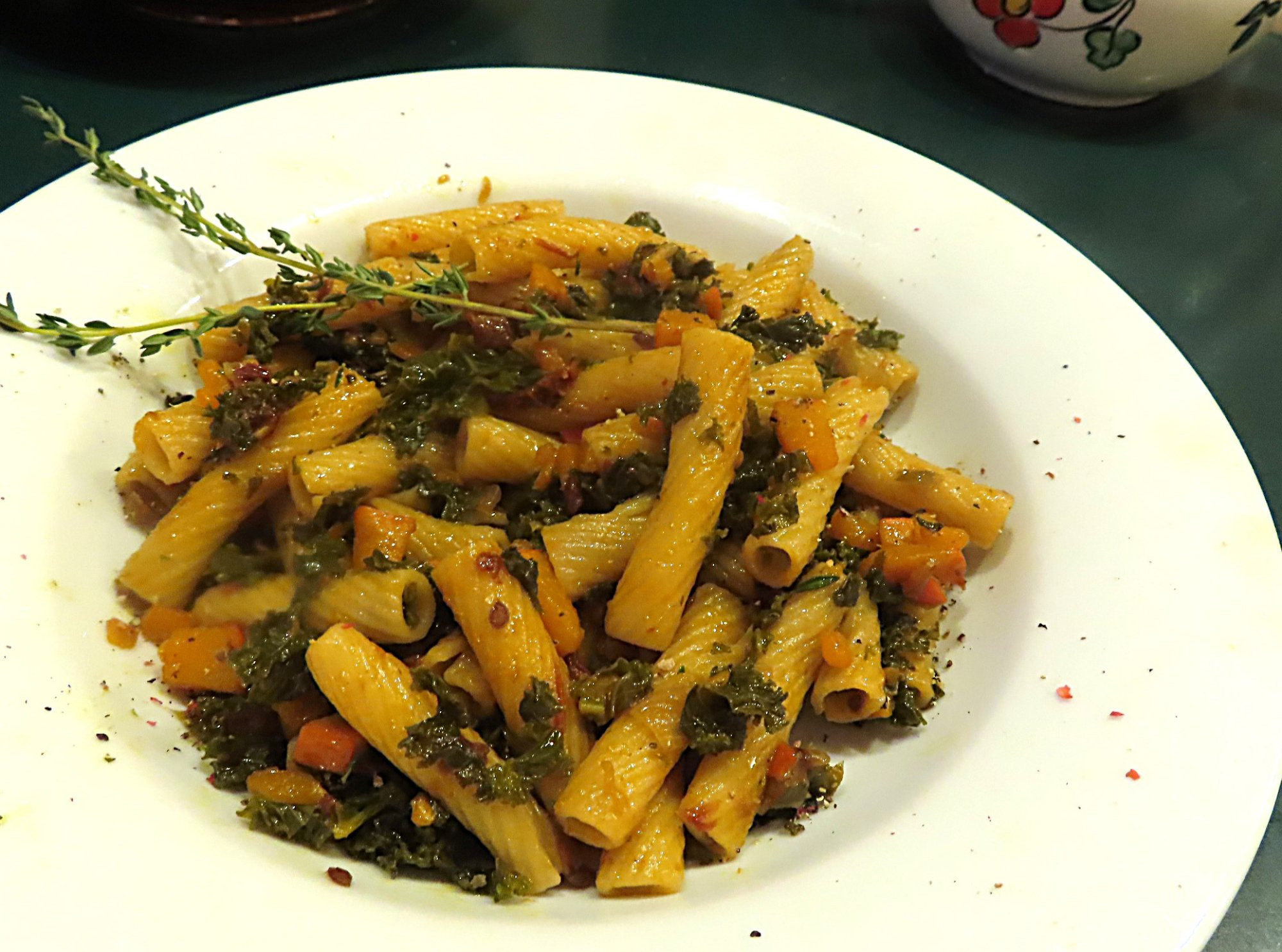Das Gemüse sehr klein geschnitten, eine Zwiebel und drei Knoblauchzehen ebenso, diese sanft in O-Öl angebraten, zuerst den Kürbis ca. 2 Minuten mitgeschmort, dann den Grünkohl, auf großer Hitze, schließlich ein paar getrocknete kleingeschnittene Tomaten und etwas Chili, immer gerührt und das Ganze mit Gemüsesuppe aufgegossen. Daß der Grünkohl so lange braucht, bis er wenigstens al dente ist, hatte ich nicht gedacht, also immer wieder aufgegossen und reduziert. Inzwischen die Pasta gekocht und zuletzt noch etwas Pastawasser und frischen Thymian dazugegeben und verkochen lassen, Parmesan und noch einen Schuß O-Öl untergerührt. Es war sehr sehr gut