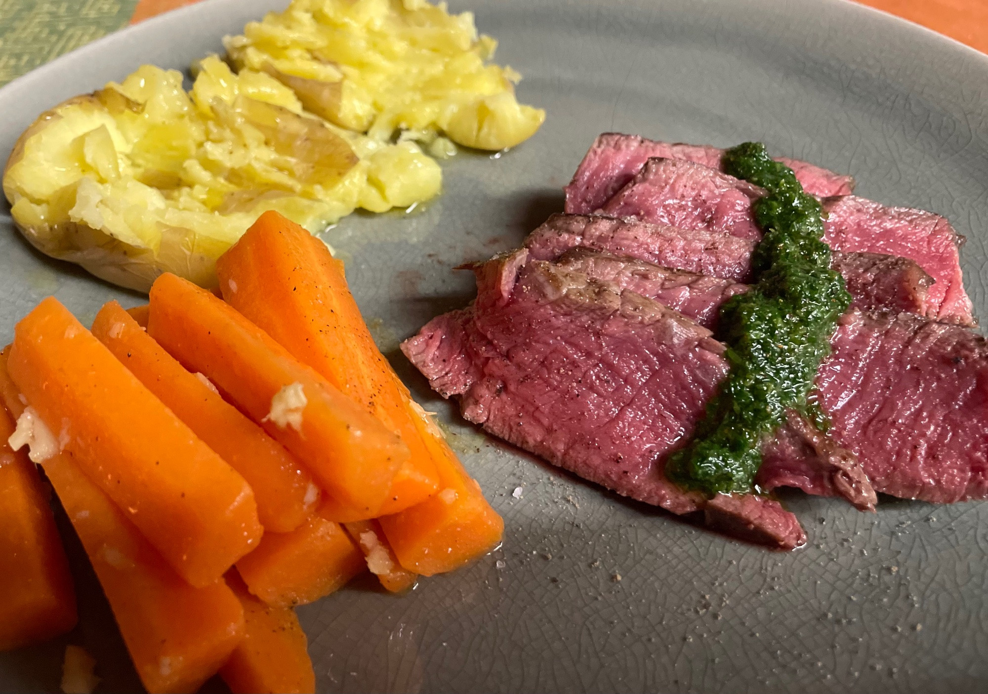 Bei uns heute Filetsteak, Ingwermöhren und zerdrückte Kartoffel mit Olivenöl. Thomas hat sich eine Sahnesauce mit grünem Pfeffer dazu gemacht. Für mich gab es zum Fleisch etwas Koriander-Chili- Irgendwas. (das was im Sieb bleibt, wenn man Korianderöl macht und dann mit Chili und Salz verfeinert)