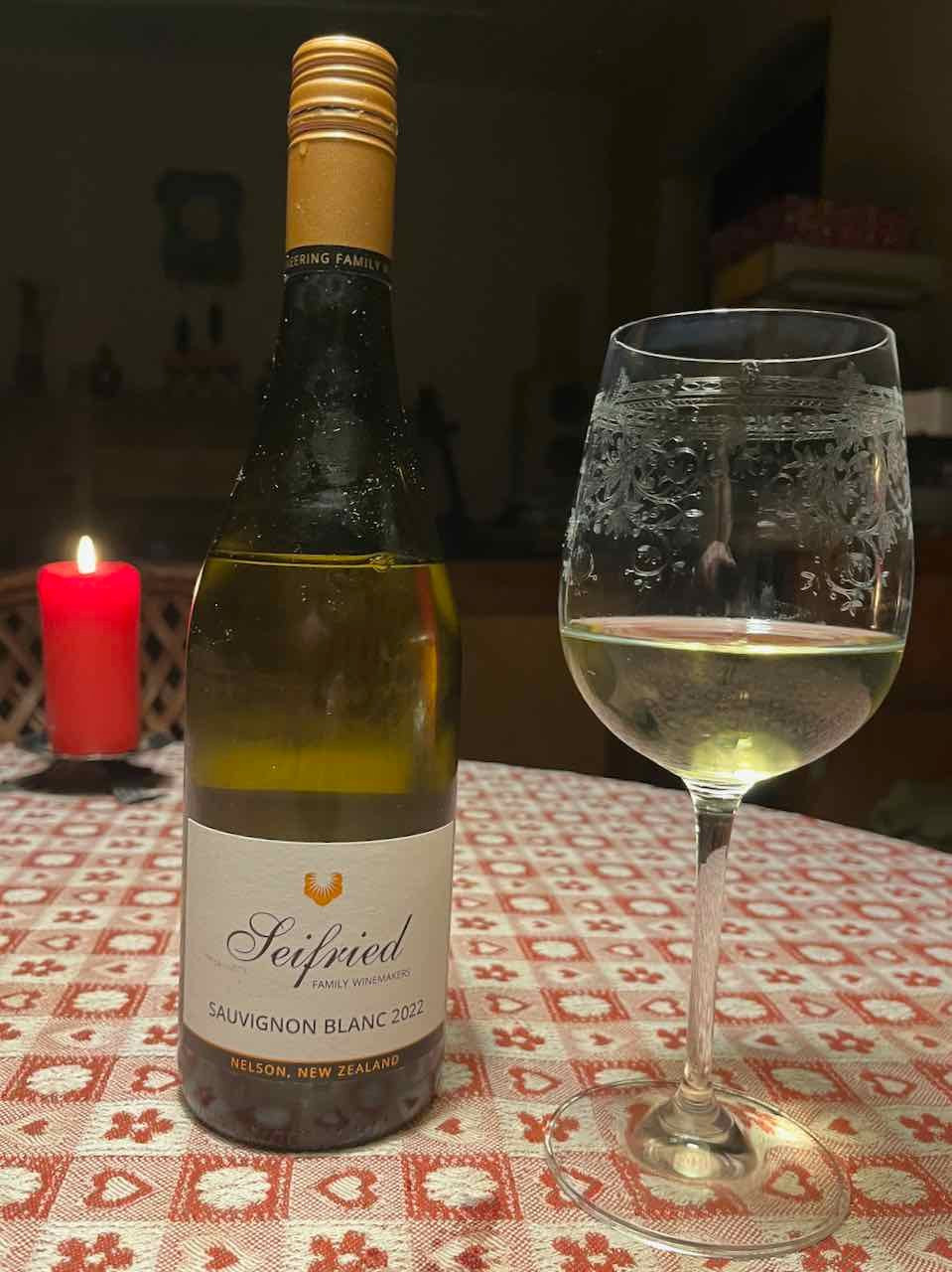Hauptgerichte Bio-Riesengarnelen, mit Knoblauch, Ingwer, Chili in Olivenöl und Zitronensaft gebraten sowie Auberginenscheiben mit Knoblauch und Rosmarin in Olivenöl gebraten und mit Zitronenpesto bestrichen zum Sauvignon blanc 2022 "Seifried" aus Neuseeland.
