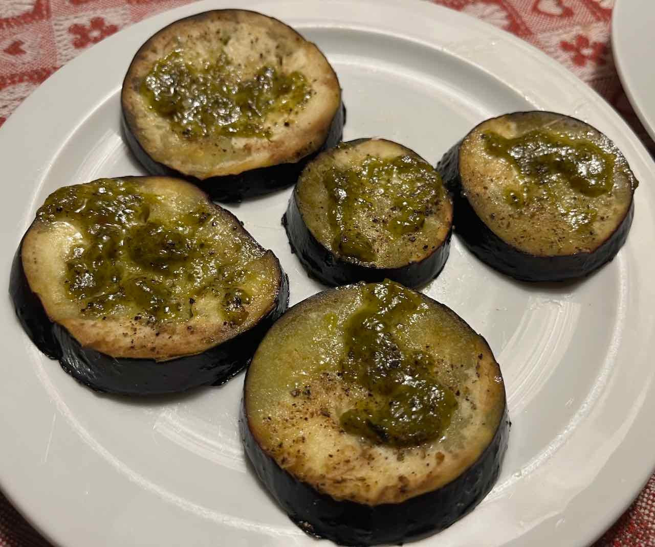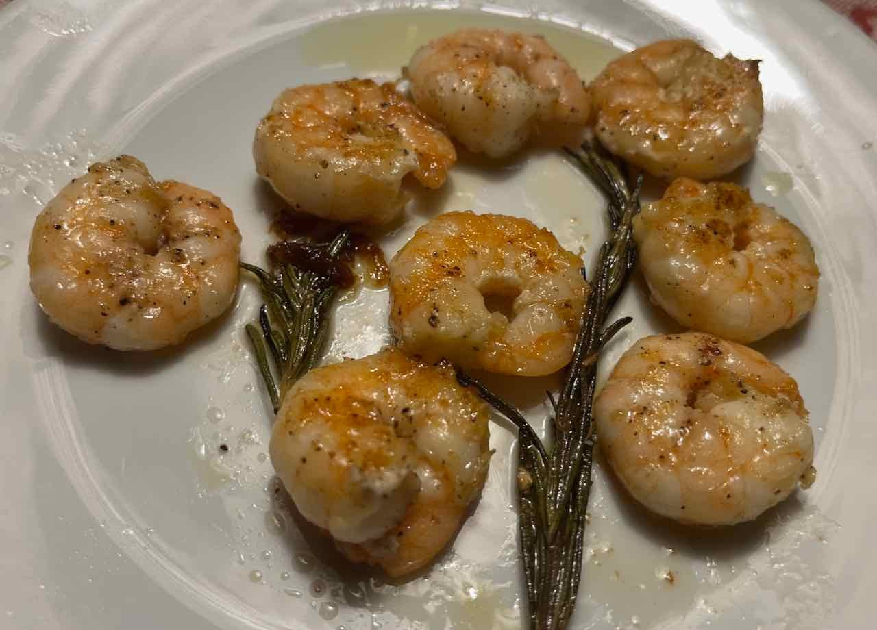 Hauptgerichte Bio-Riesengarnelen, mit Knoblauch, Ingwer, Chili in Olivenöl und Zitronensaft gebraten sowie Auberginenscheiben mit Knoblauch und Rosmarin in Olivenöl gebraten und mit Zitronenpesto bestrichen zum Sauvignon blanc 2022 "Seifried" aus Neuseeland.