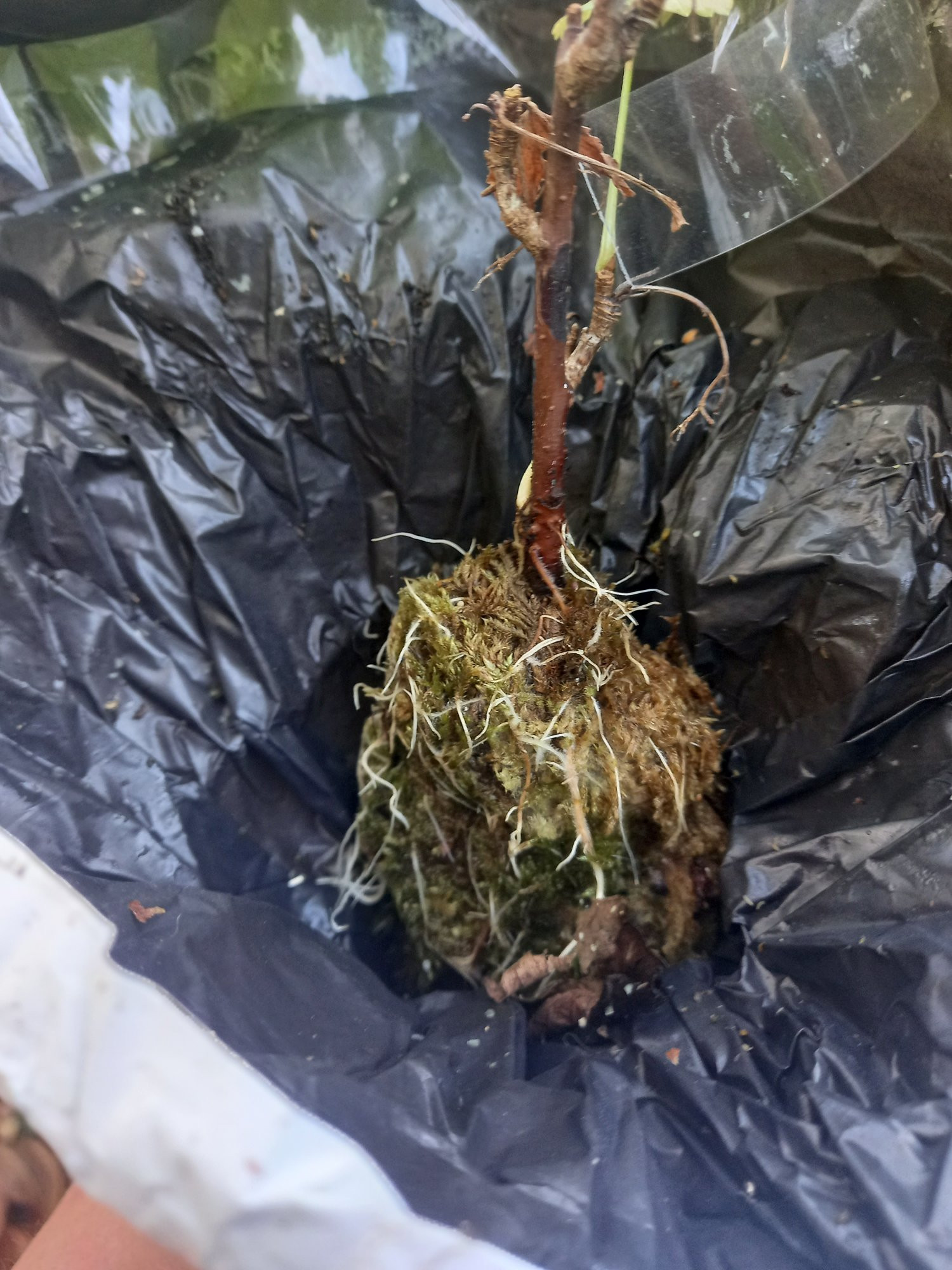 Habe gestern die wenigen regenfreien Minuten genutzt und eine Folie genommen. Außen weiß, innen schwarz (Was man vom Chinesen-Versand so bekommt). Befüllt mit regennassem Moos. Oben und unten zu gebunden. Mit einem Faden noch das Moos strammer an den Ast gebunden. Das ganze an einen Haselstock gebunden.