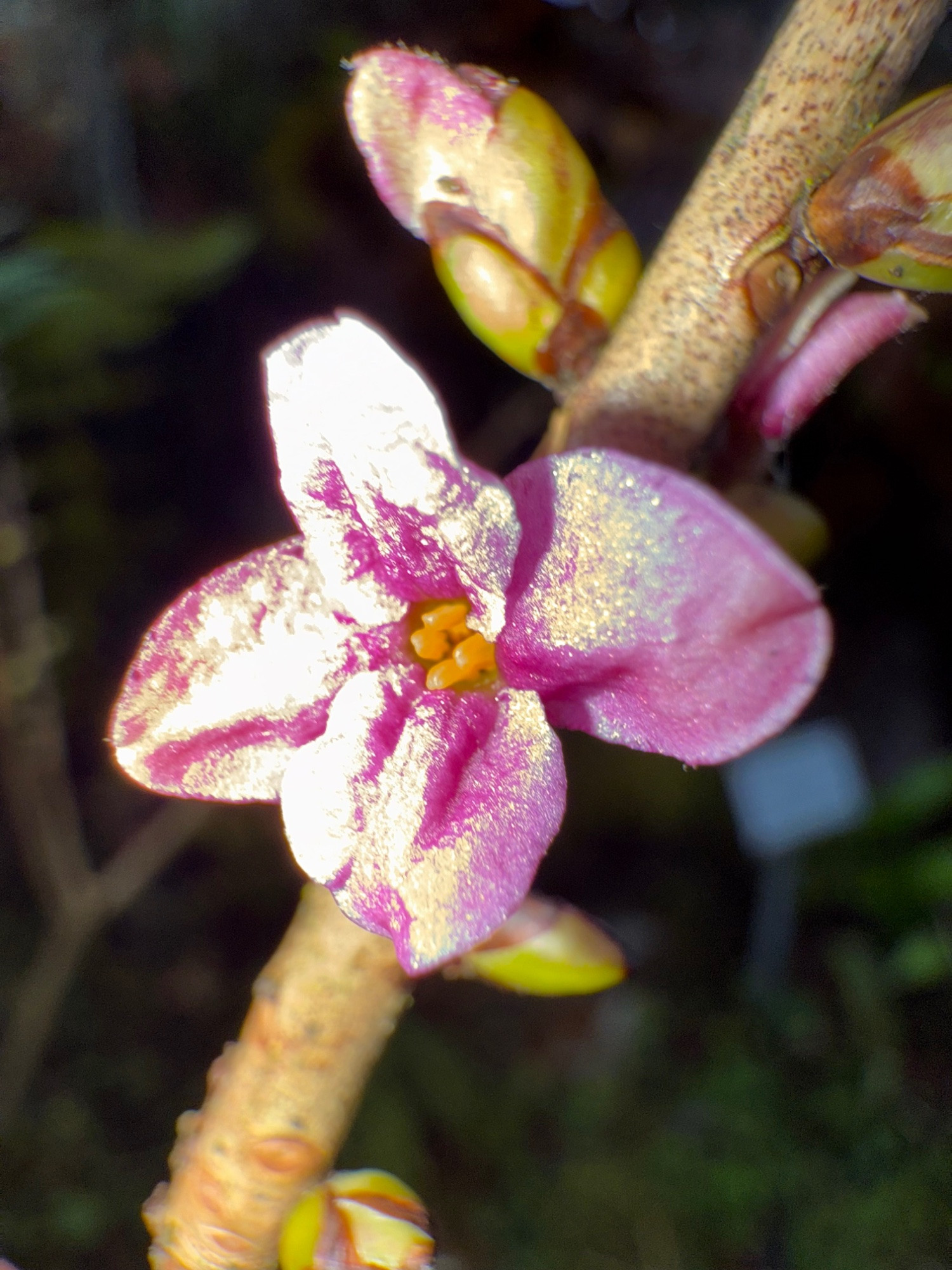 Daphne mezereum ist auch noch verwirrt durch das Wetter und blüht