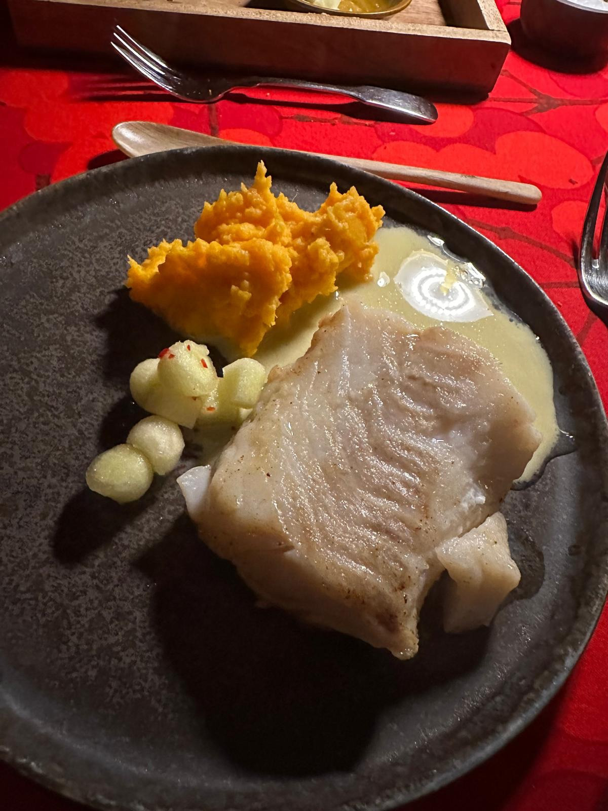 Danach Kafirlimettensorbet, Kabeljau mit Beurre Blanc, Süßkartoffelstampf (das nächste mal wieder mit Fregola Sarda) und Granny Smith-Limetten-Chili-Kugeln. Die Kapuzinerkresseblattdeko fehlt.