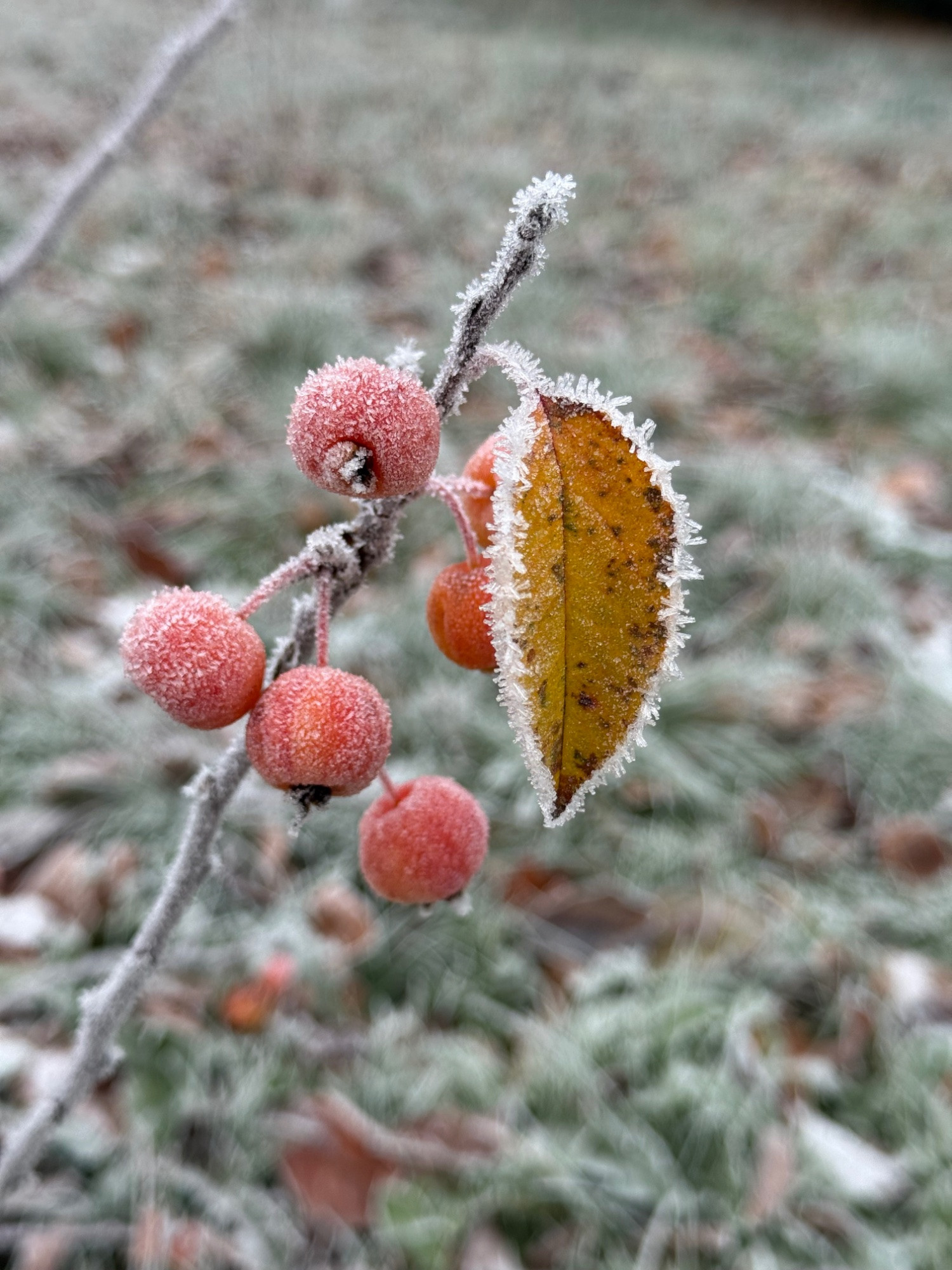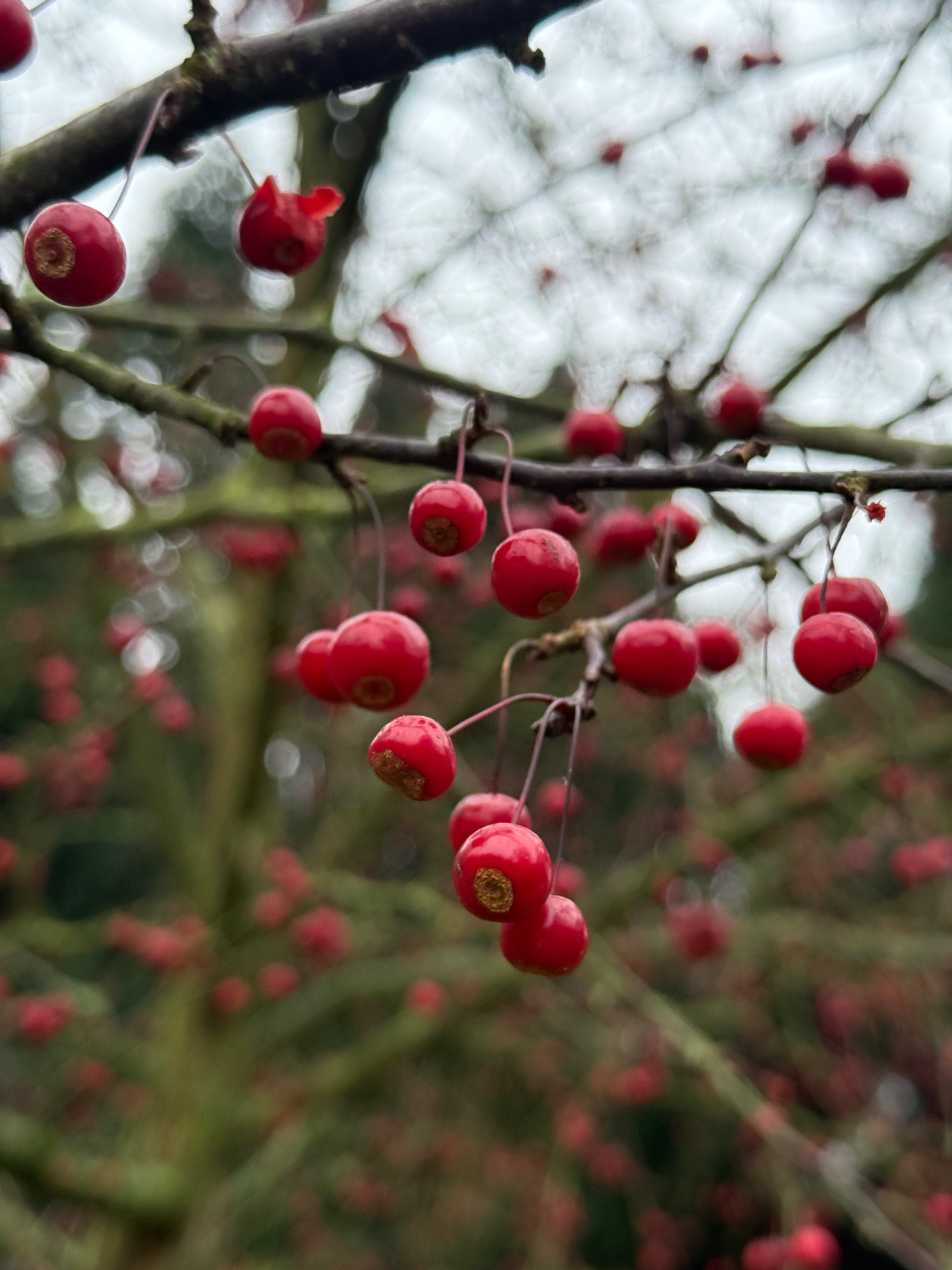 Malus red sentinel. Das Laub ist gefallen, die Äpfelchen bleiben hängen. In diesem Winter gibt es für die Amseln einiges zu knabbern.