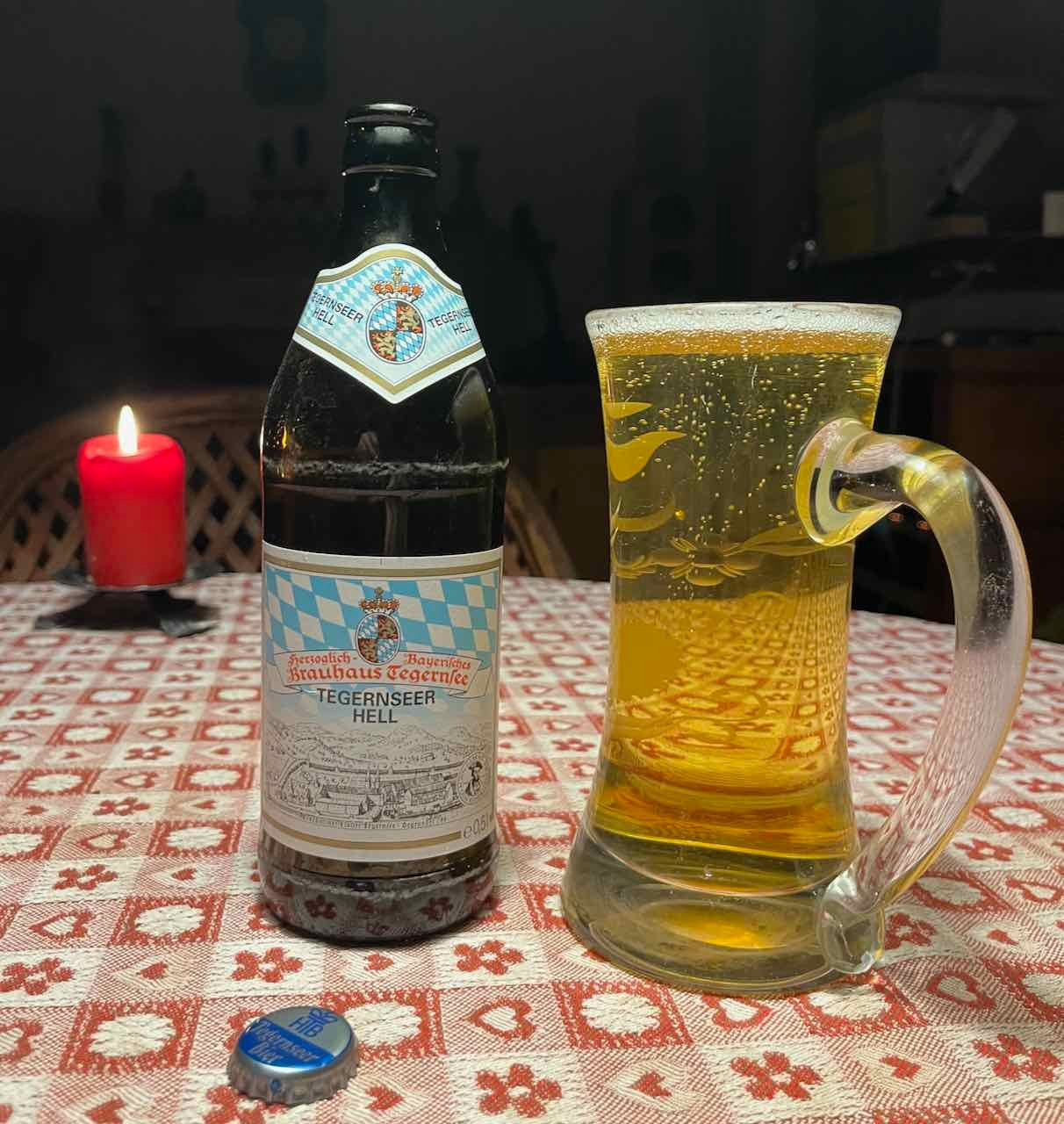 Thüringer Rostbratwurst mit mittelscharfem Develey-Senf sowie Kartoffelpüree mit Schnittlauch zum Tegernseer Hell. Ganz gegen die Tradition mit Besteck (nicht aiuf den Fotos).