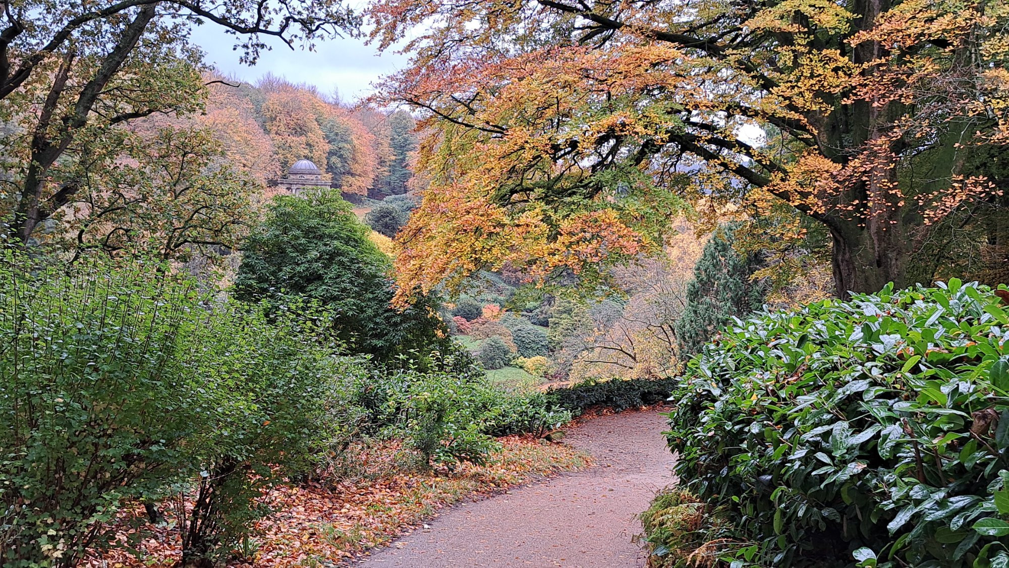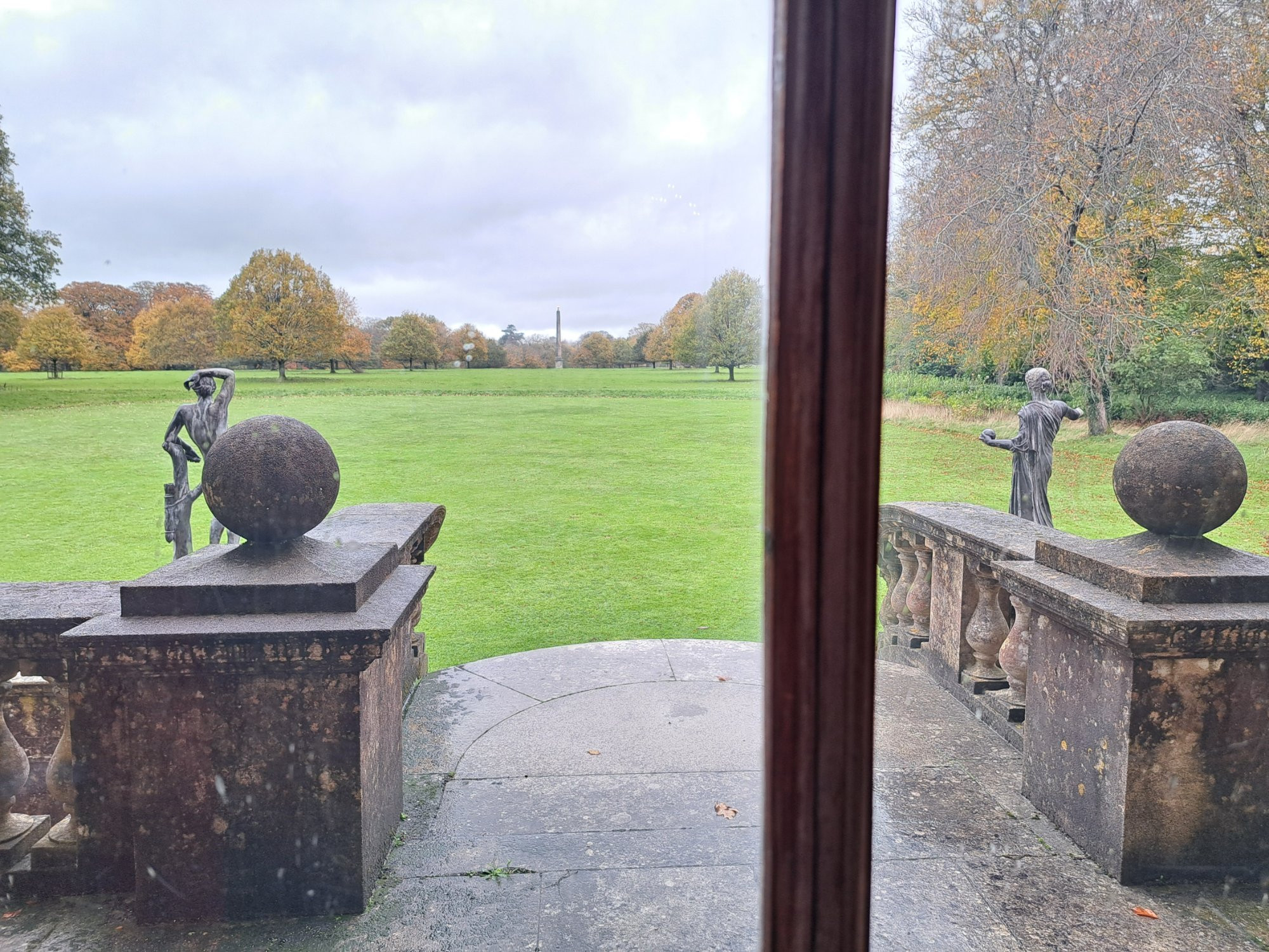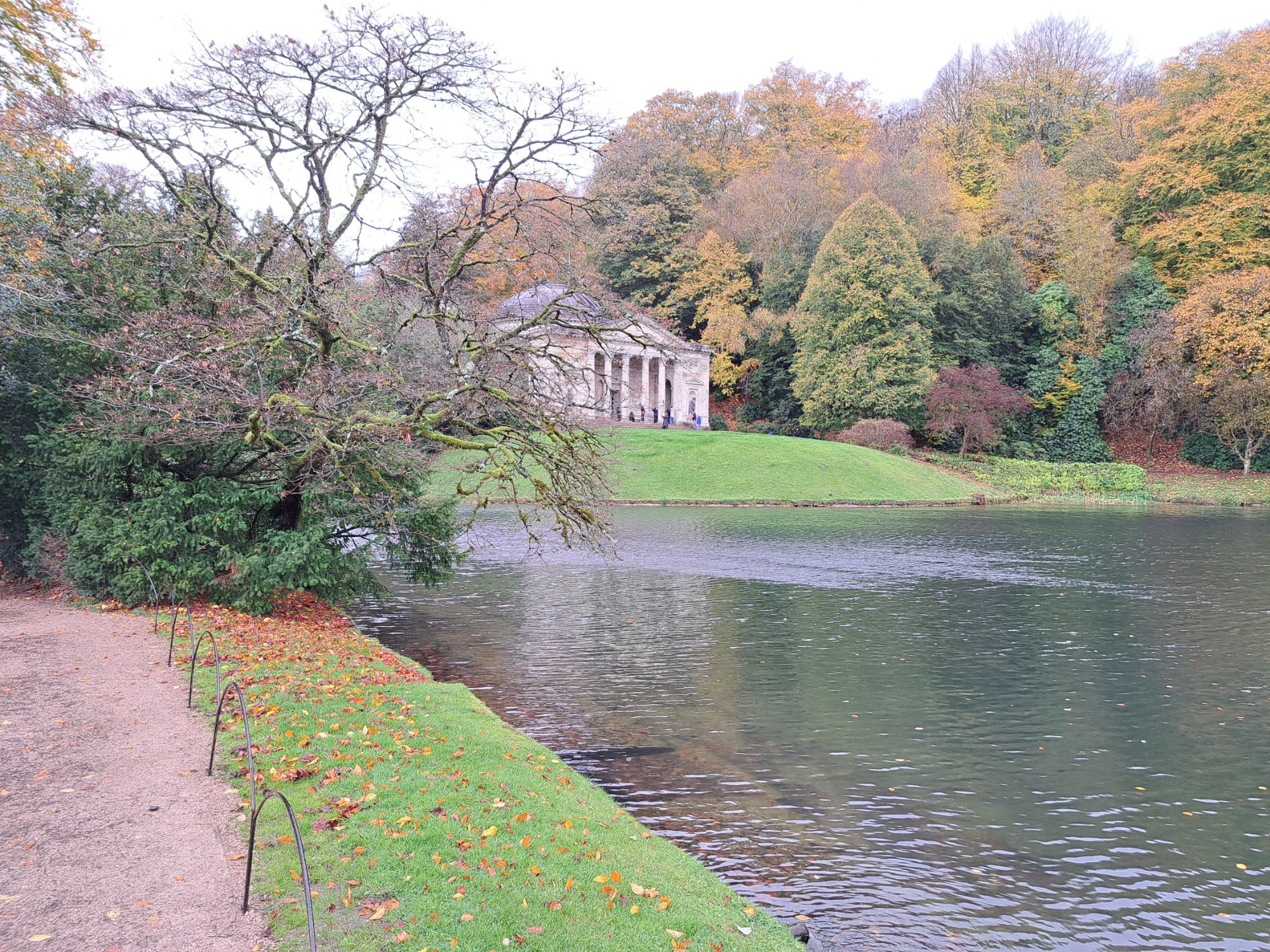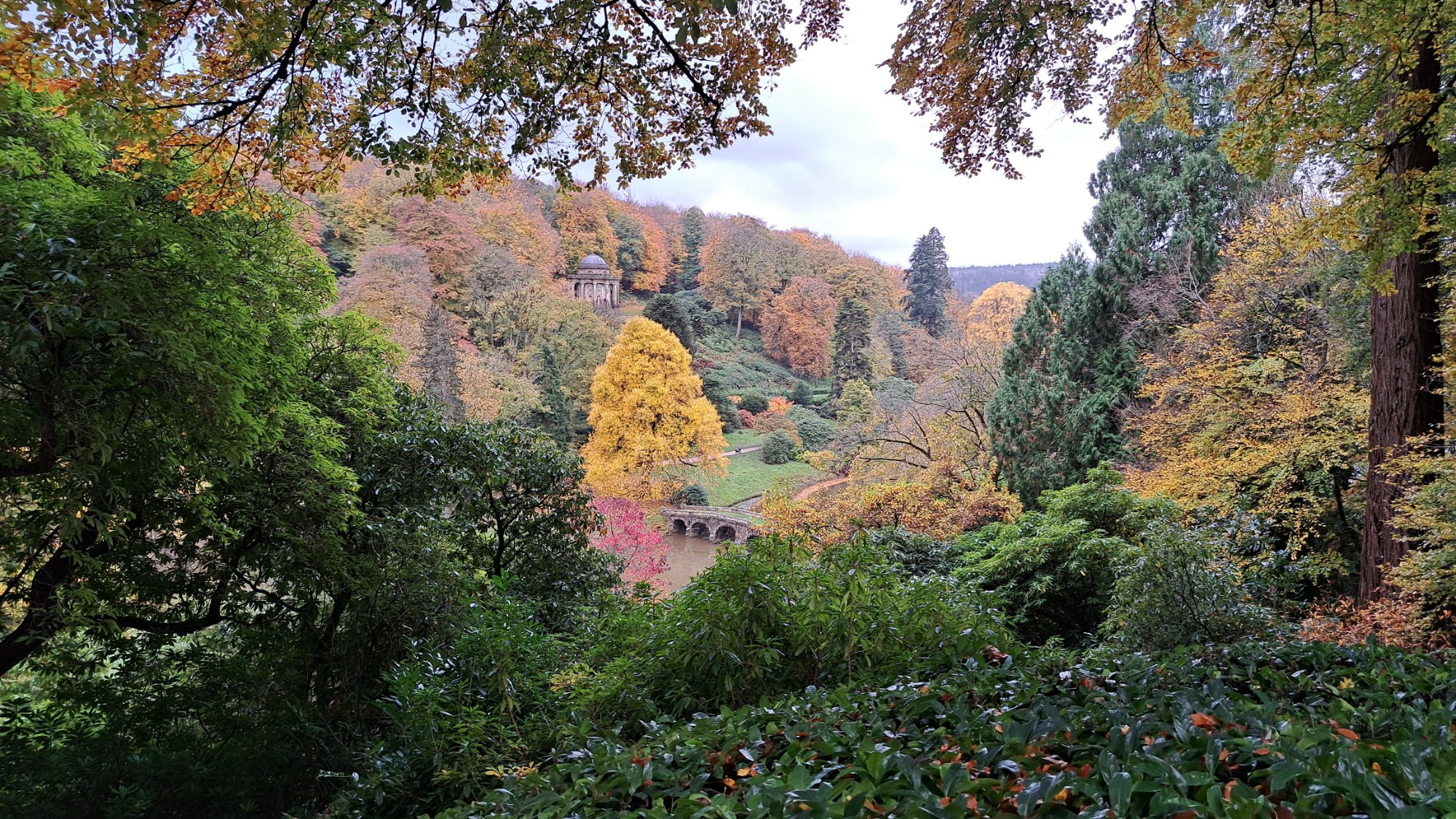Rückblick zum Temple of Flora. Dort links hinter dem Hügel steht das Herrenhaus.