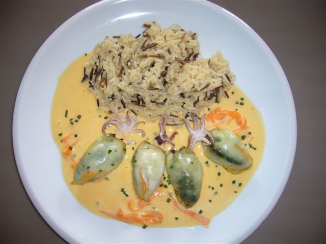 heute gab es:BlattsalatTintenfische gefüllt mit Spinat auf Zitronensauce mit ReisBananen im Blätterteig