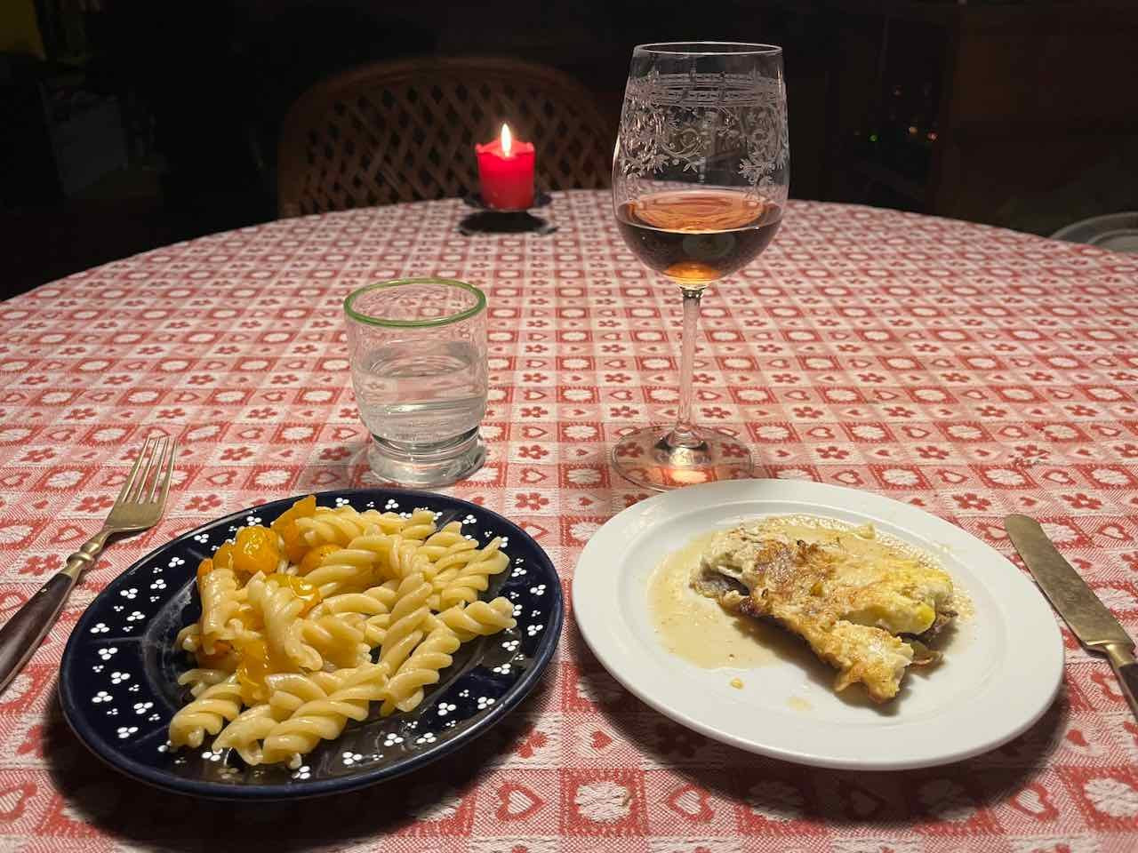 Vorspeise Enoki-Pilze mit Knoblauch in Olivenöl und Butter gebraten, Hauptgerichte Kabeljaufilet mit Dinkelmehl, Ei und Kren mariniert, in Olivenöl gebraten und mit Zitronensaft beträufelt sowie Fusilloni aglio e olio mit gelben und orangen Kirschtomaten zum Rosé 2019 "Isle of Beauty" aus Neuseeland. Due Reihenfolge der Bilder ist eigentlich umgekehrt, aber ich lasse es so.