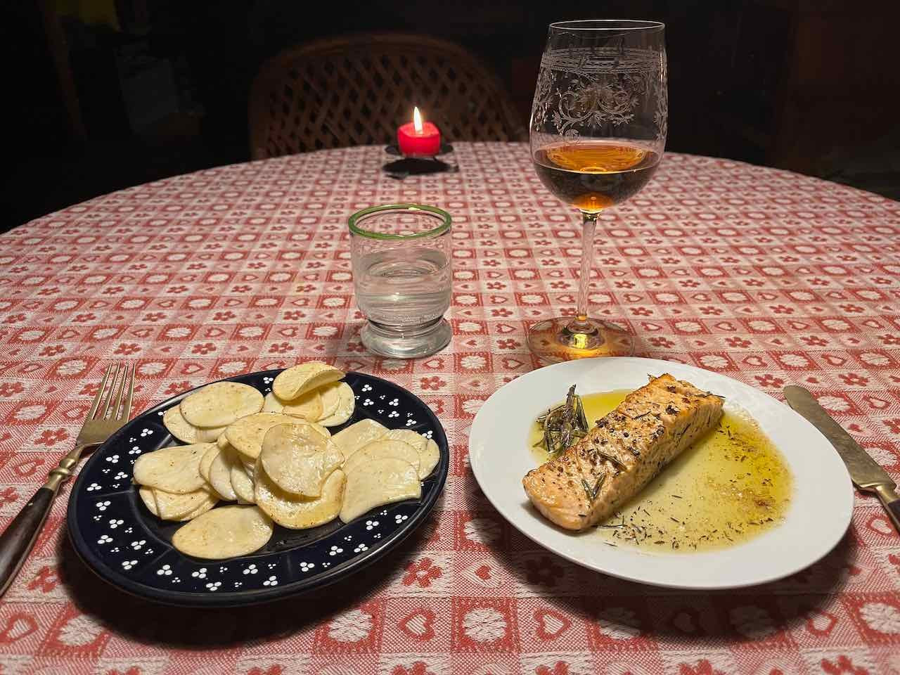 Bio-Lachsfilet in Zitronen-Thymian-Butter mit Knoblauch und Rosmarin gebraten sowie Croxetti aglio e olio zum Pinot Blanc "Black Forest" aus Baden