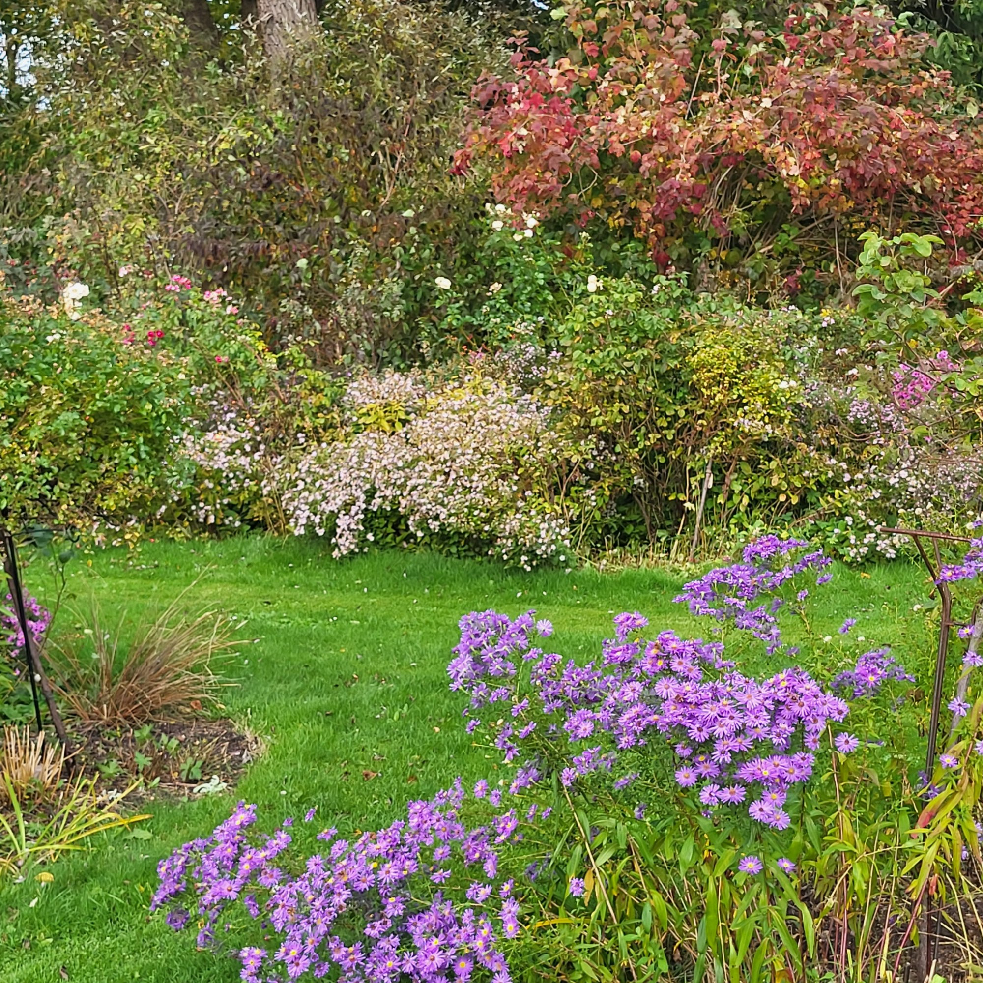 Heute Morgen ein Gartenspaziergang im Sonnenschein. Wir hatten schon zweimal Frost, daher liegen schon viele Blätter am Boden und die Astern haben ihren Höhepunkt überschritten. Einige Chrysanthemen werden in diesem Jahr eine Blüte nicht mehr schaffen.