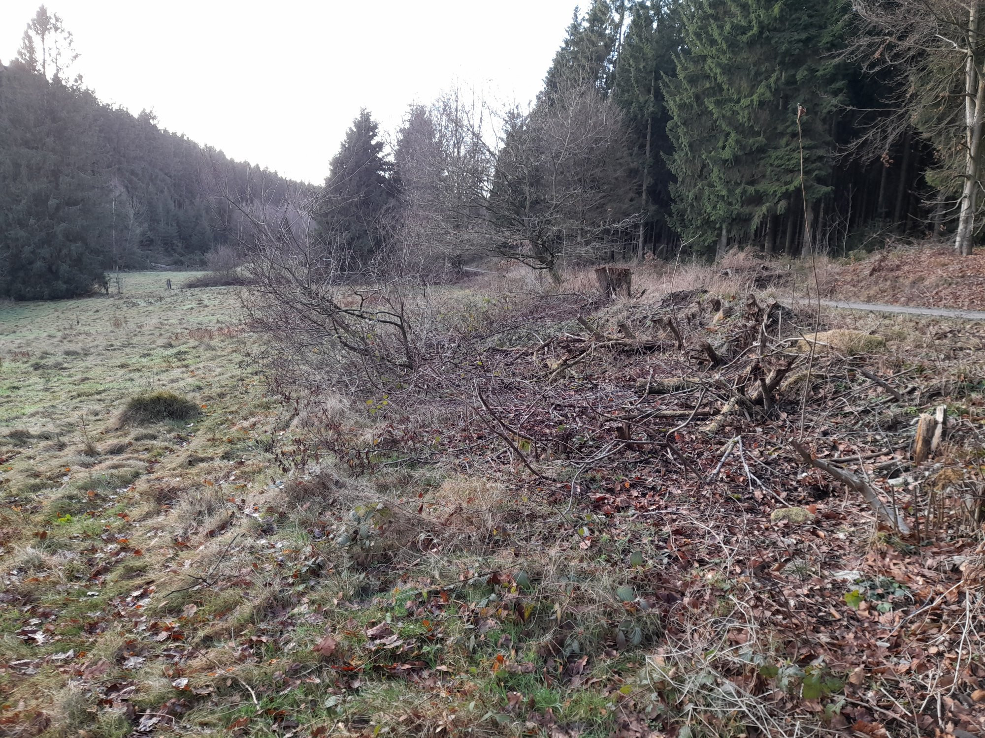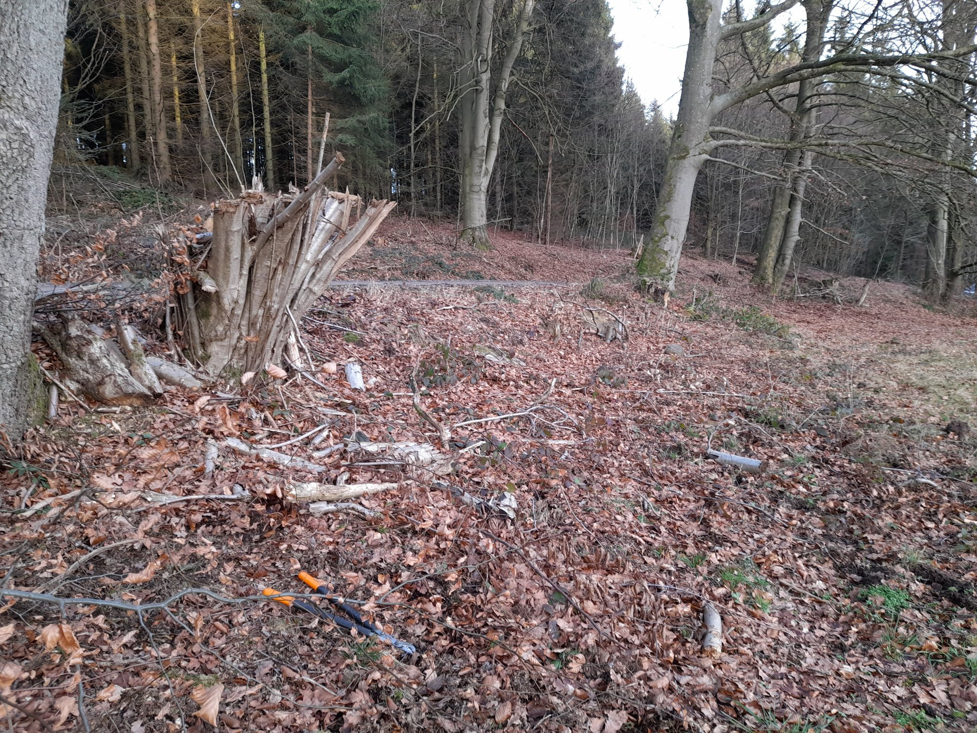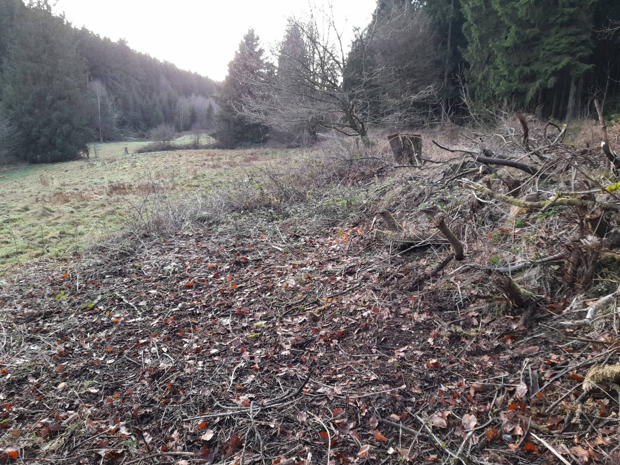 Nachmittags, weil Sonne gewandert, Einsatz auf den Wohlkopfswiesen. Zudem konnte unsere Wwooferin so zu Fuß das Tal erkunden, während ich schon mal angefangen habe. Es galt das Chaos des maschinellen Forsteinsatzes aufzuräumen