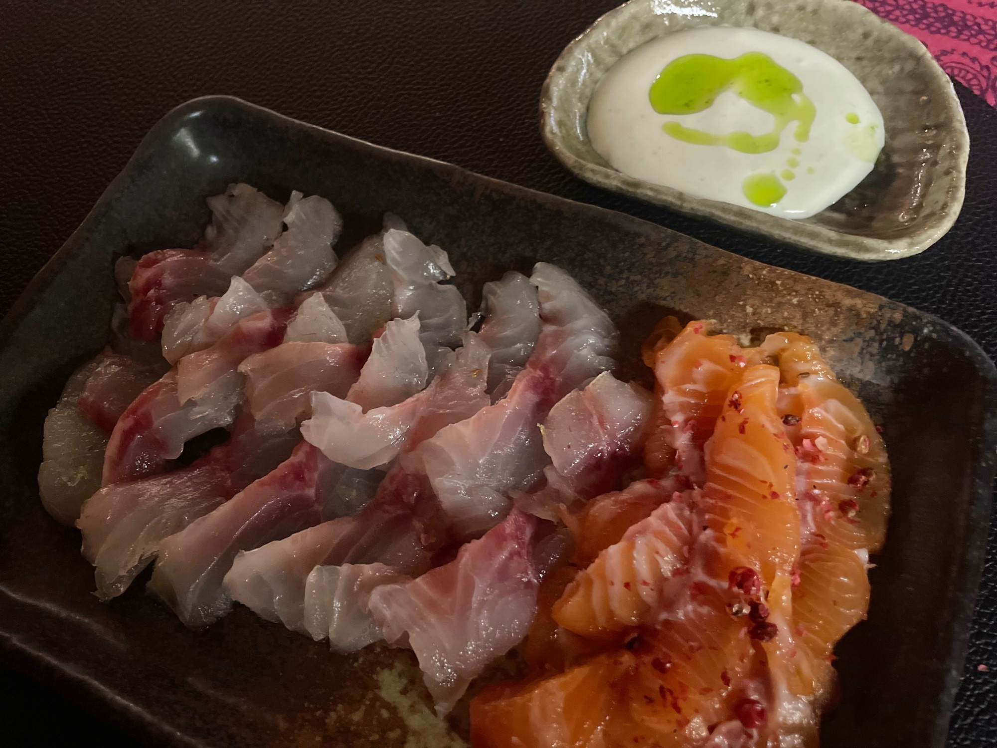 Bei uns gab es heute Dorade und Lachs kurz (40 Minuten) gebeizt mit Wasabicreme mit Korianderöl.