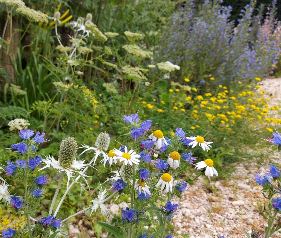 Campanula lactiflora im Hintergrund, Blutpflaume, Rosen, Yucca filamentosa und anderes
