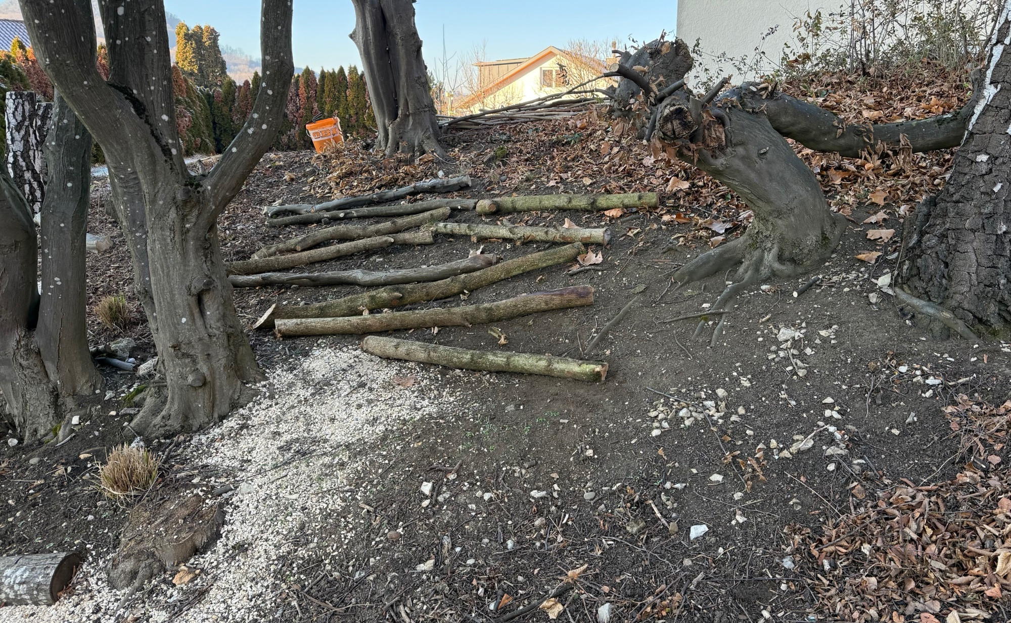 Holzstämmchen ausgelegt. An diese Stelle ist nie was gewachsen. Ich will zwischen den Holzstämmen mit Kompost und Häckseln auffüllen und dort Cyclamen coum Sämlinge setzen. Hoffentlich werden die dort wachsen. Ich habe die Buchen aufgeastet, so kommt hoffentlich mehr Regen hin. Holzstämmchen werde ich gegen abrutschen mit den Pflöcken befestigen. Rechts ist meine neue Terrassenbeet, dem ich diesen Sommer gemacht habe.