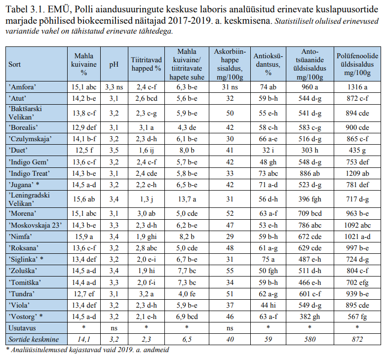 Ist wahrscheinlich für dich nicht wirklich relevant, aber vielleicht trotzdem irgendwie nützlich, hier aus oben genannter Quelle ein direkter Vergleich von u.a. Anthocyan- und Polyphenolgehalt (vorletzte und letzte Spalte) in weit verbreiteten Sorten:Oxygen hat geschrieben: ↑29. Dez 2025, 23:42 Danke für die schnelle Antwort. Die o.g. Sorten sind laut Literatur diejenigen mit dem höchsten Polyphenol- und Anthocyangehalt (wobei ich natürlich nicht an jede Primärliteratur herangekommen bin oder Lust hatte mir 50 Seiten aus dem russischen durch google übersetzen zu lassen...). Aronia- und Felsenbirnen stehen bereits im Garten, da ist das Sortenchaos erfreulicherweise auch nicht vorhanden. Apfelbeeren sind tatsächlich eine gute Quelle für Anthocyane, aber die KB-Sorte Selena reicht da schon fast ran (1828 mg/100g).