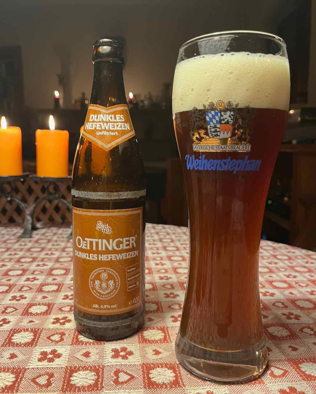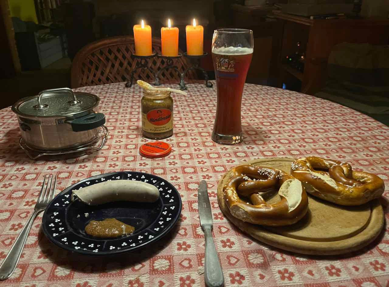Weißwürste mit süßem Senf und Brezn zum dunklen Weißbier aus Oettingen