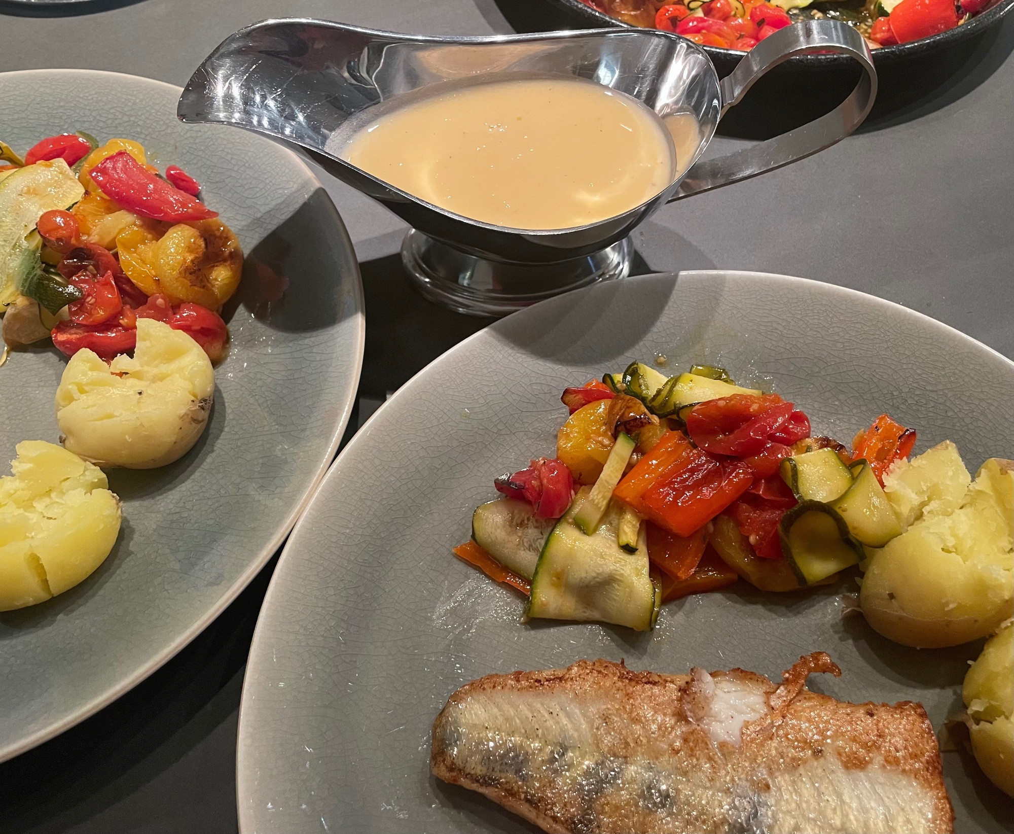 Bei uns heute die allerletzten eigenen Tomaten aus dem Ofen, Zander in Butter gebraten dazu Beurre Blanc.