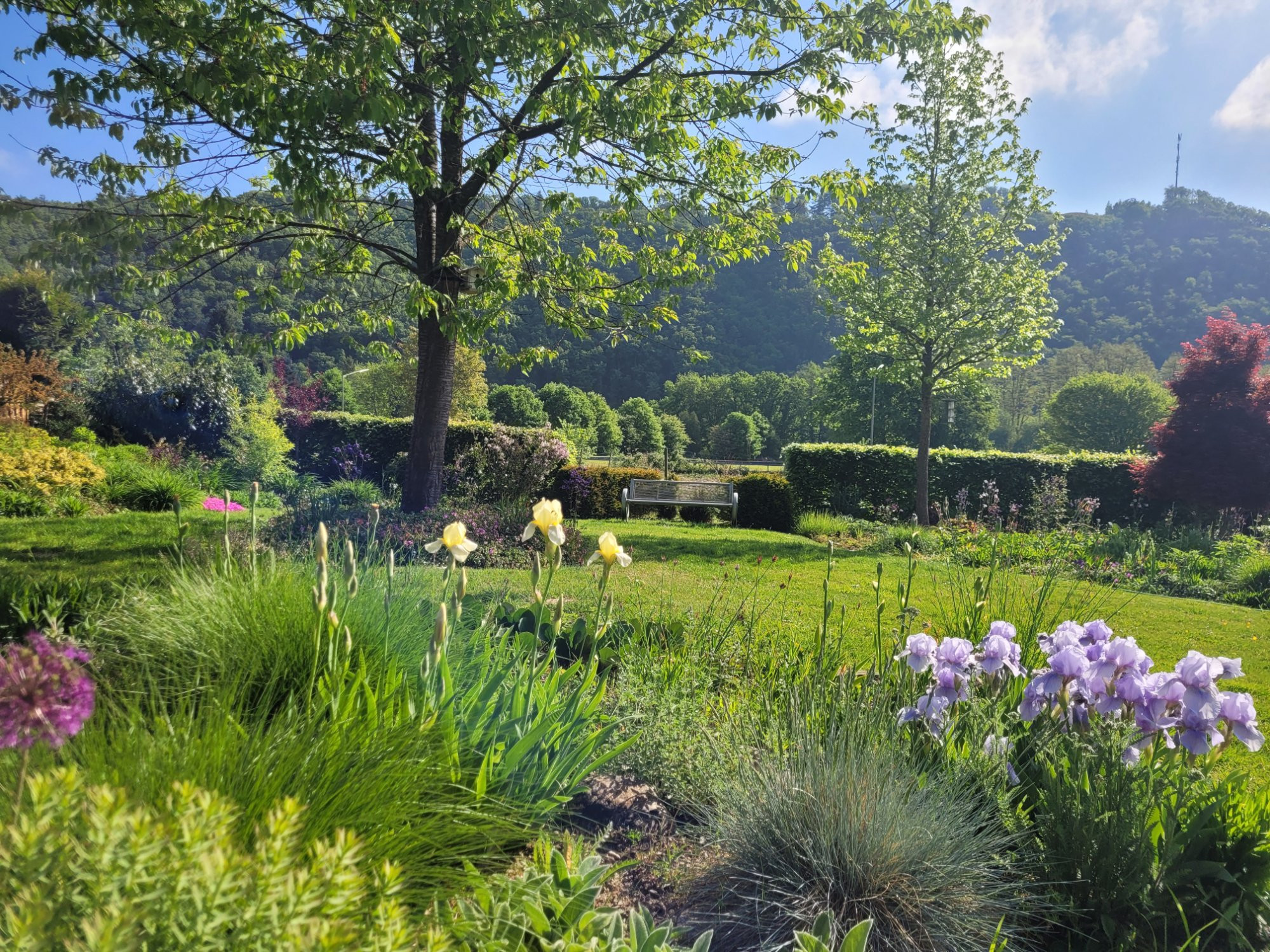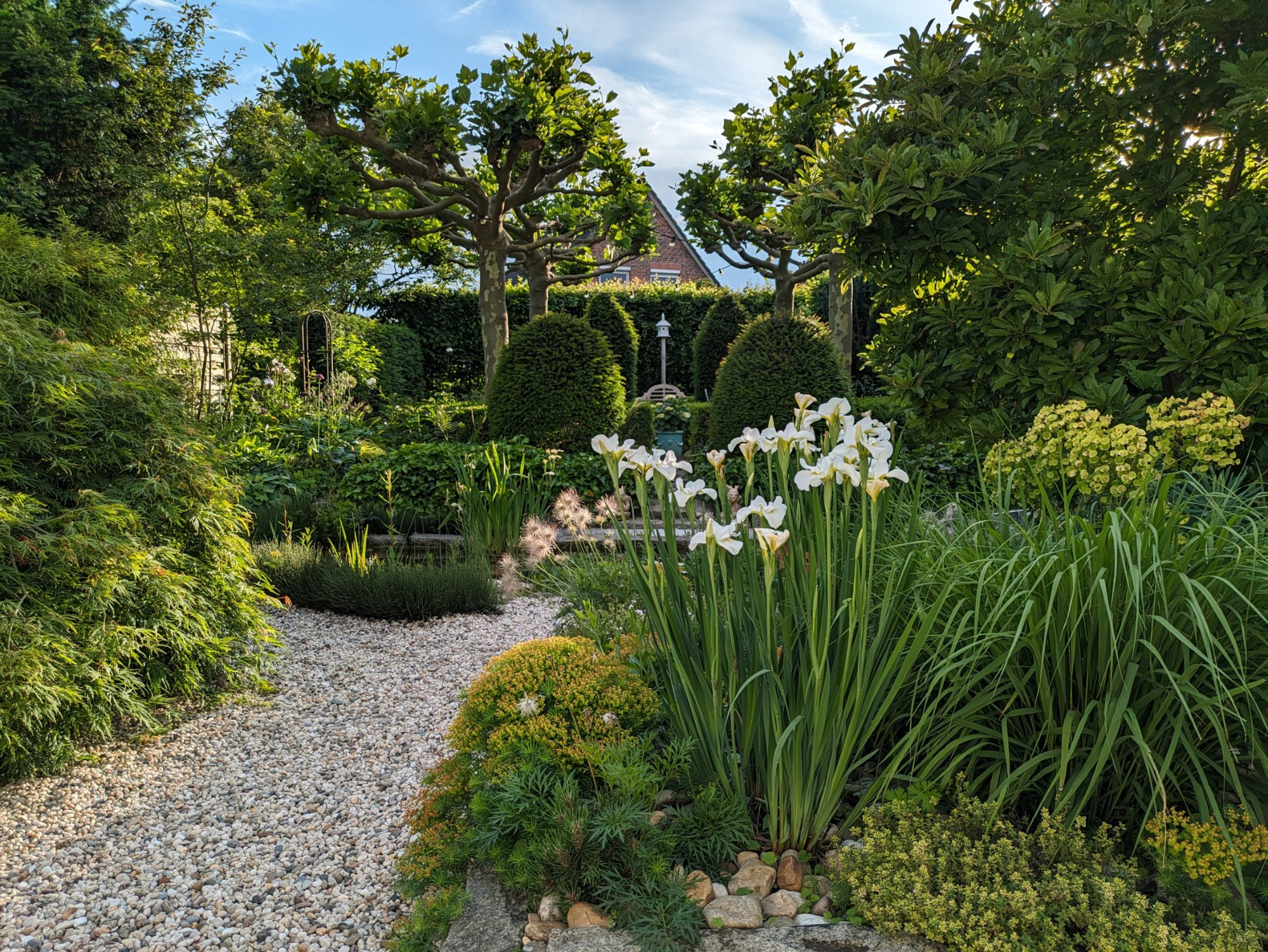 Ich lege an die Steine und den Ahorn an und biete Iris sibirica, Pulsatilla, verschiedene Euphorbia, Magnolia stellata, Wasser und Platanen.