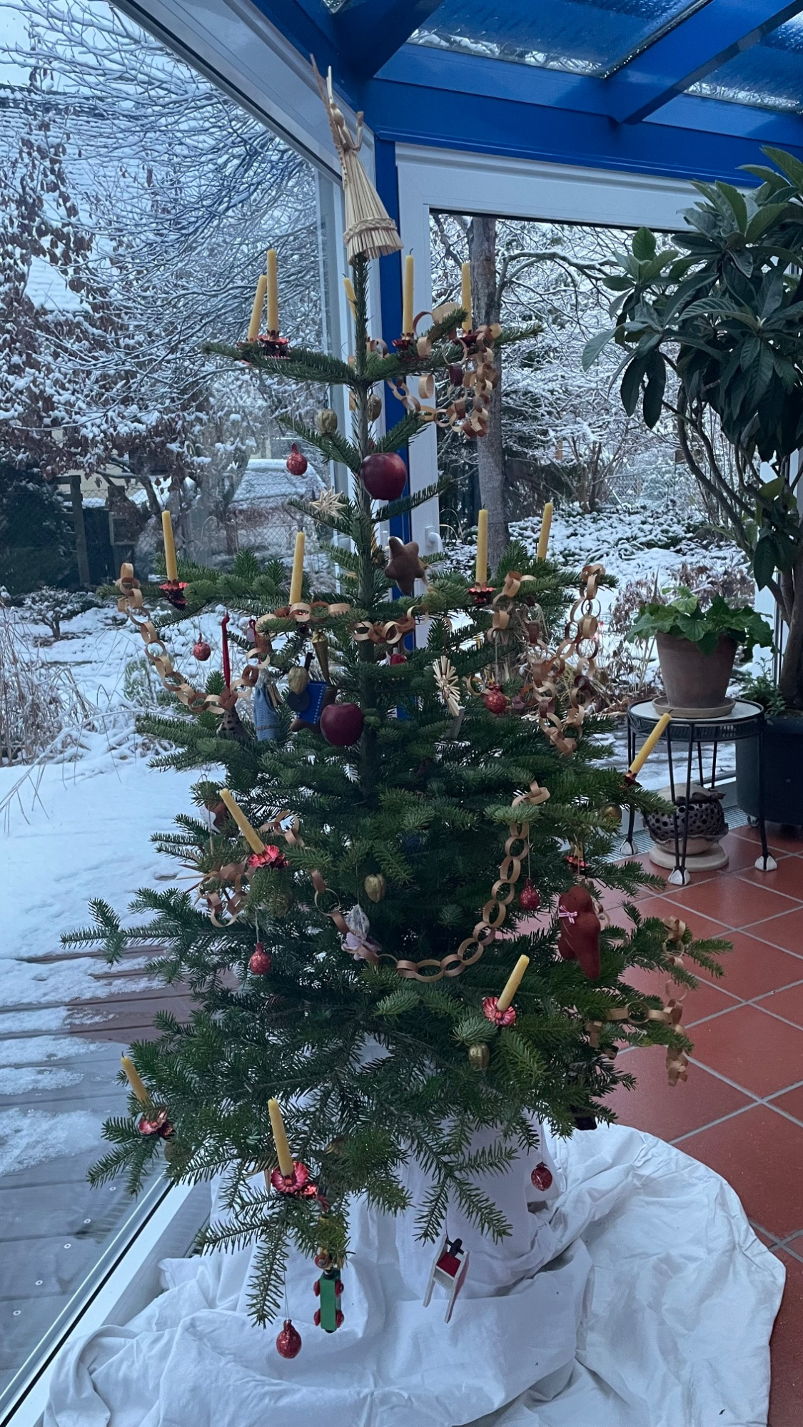 Im Wintergarten, der nur für den Weihnachtsbesuch gut geheizt wurde, jetzt hat es da weniger als 10° drin und der Baum hält lange.