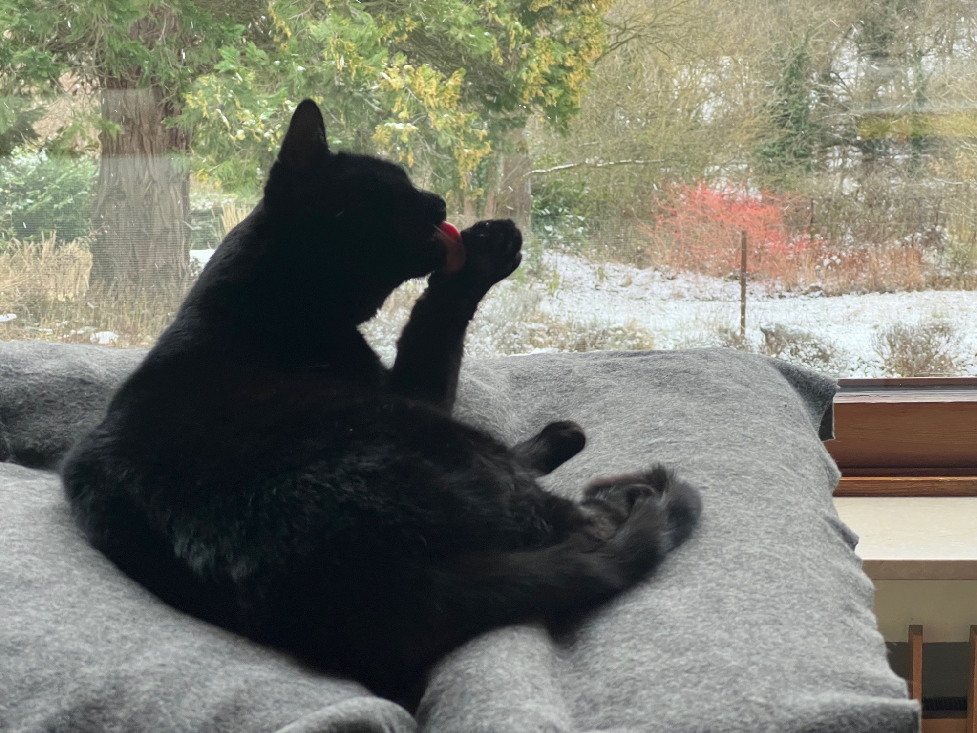 Es tut hier so, als sei Winter. Der Katz glaubt es sogar und putzt gründlich die Pfote.