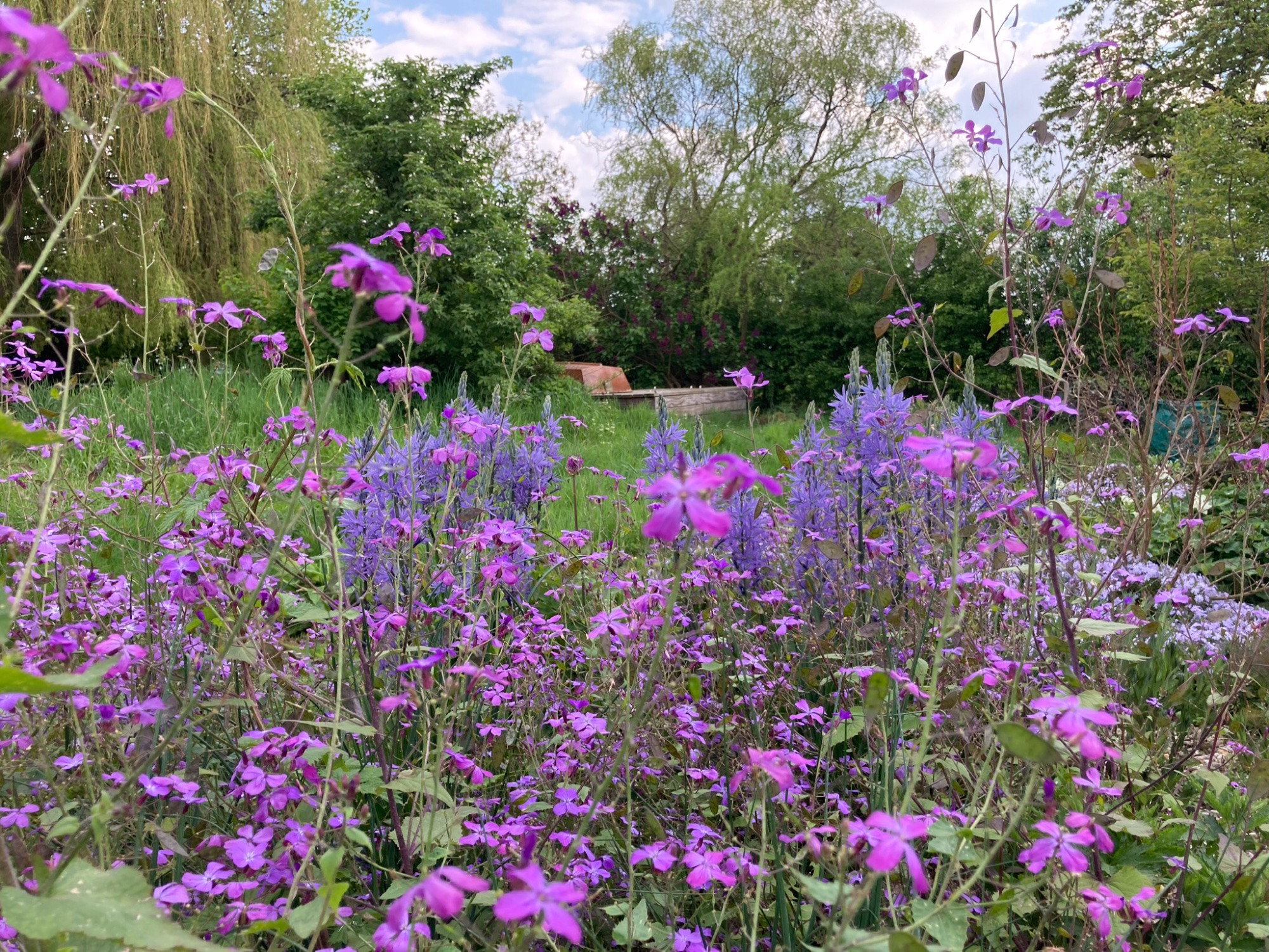 Weiß nicht, warum das funktioniert und ob es das dauerhaft tut. Ich wollte einfach all die Entdeckungen aus dem Forum ausprobieren. Und manchmal sind mir da wohl die die Gäule durchgegangen. Der Boden ist lehmig und nährstoffreich, und dann explodiert das eben. Ich fand das lustig in diesem Juli, wie dann so viel auf einmal blühte und alles bunt und durcheinander wuchs. Wird sicher ruhiger werden mit der Zeit, wenn ich mich erstmal ausgetobt habe. Zum Glück gibt es als Hintergrund ganz viel große, grüne Gehölze. Die sieht man nur auf dem Foto nicht.