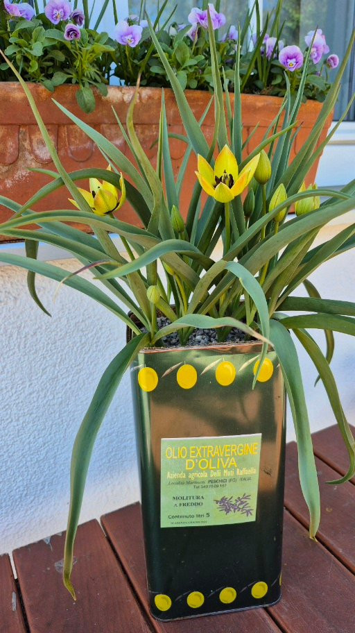 Tulpen in Gefäß, Kanister, Bank, Tisch, Viola, Blumenkasten...