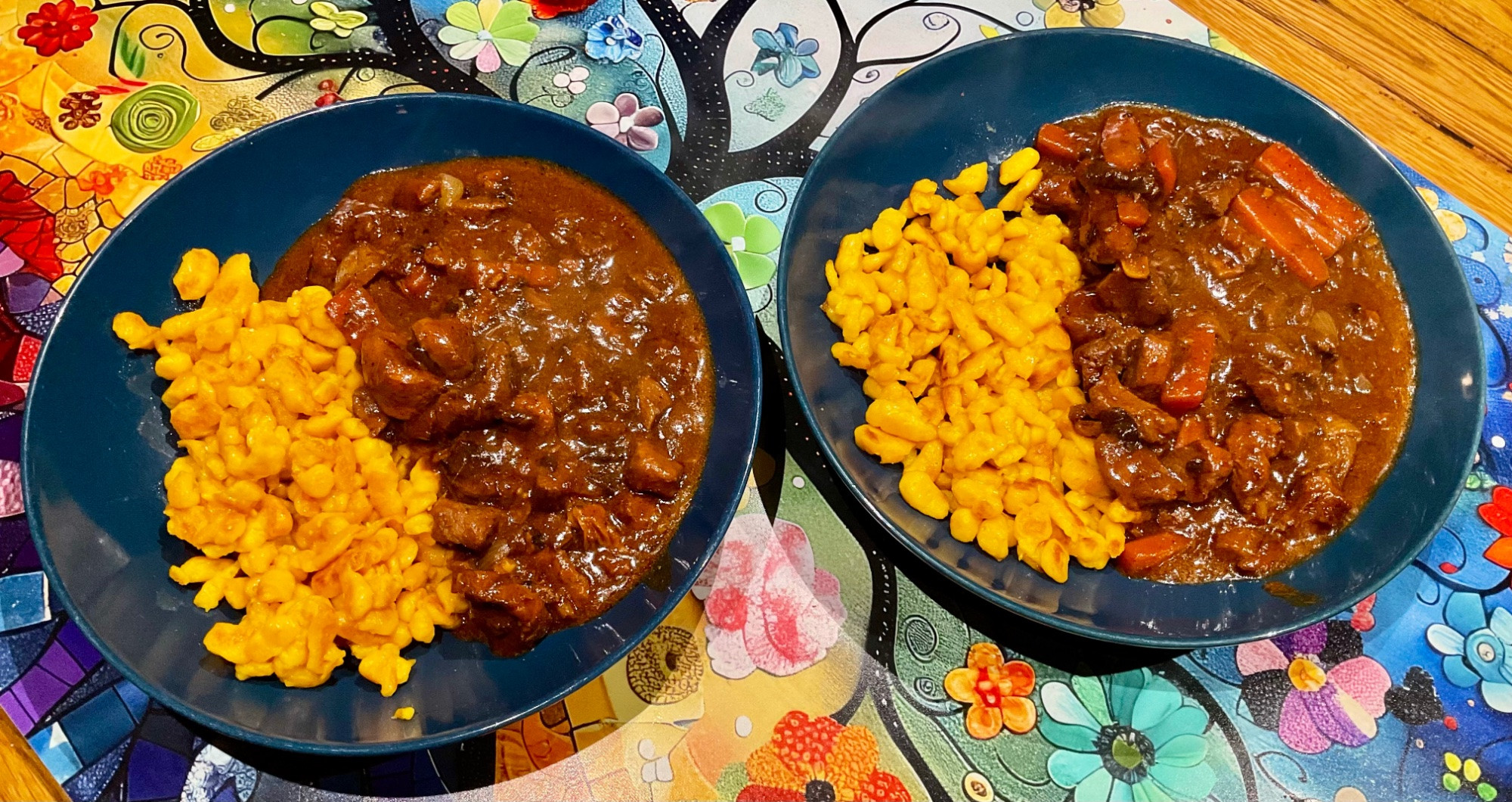 Vielen Dank, die Spätzle waren übrigens selbst gemacht. Ich hatte beim letzten Mal den Überschuss eingefroren, das hat super gepasst und reicht auch noch für heute. Das Gulasch wurde wieder mit Guiness gekocht, sehr lecker.