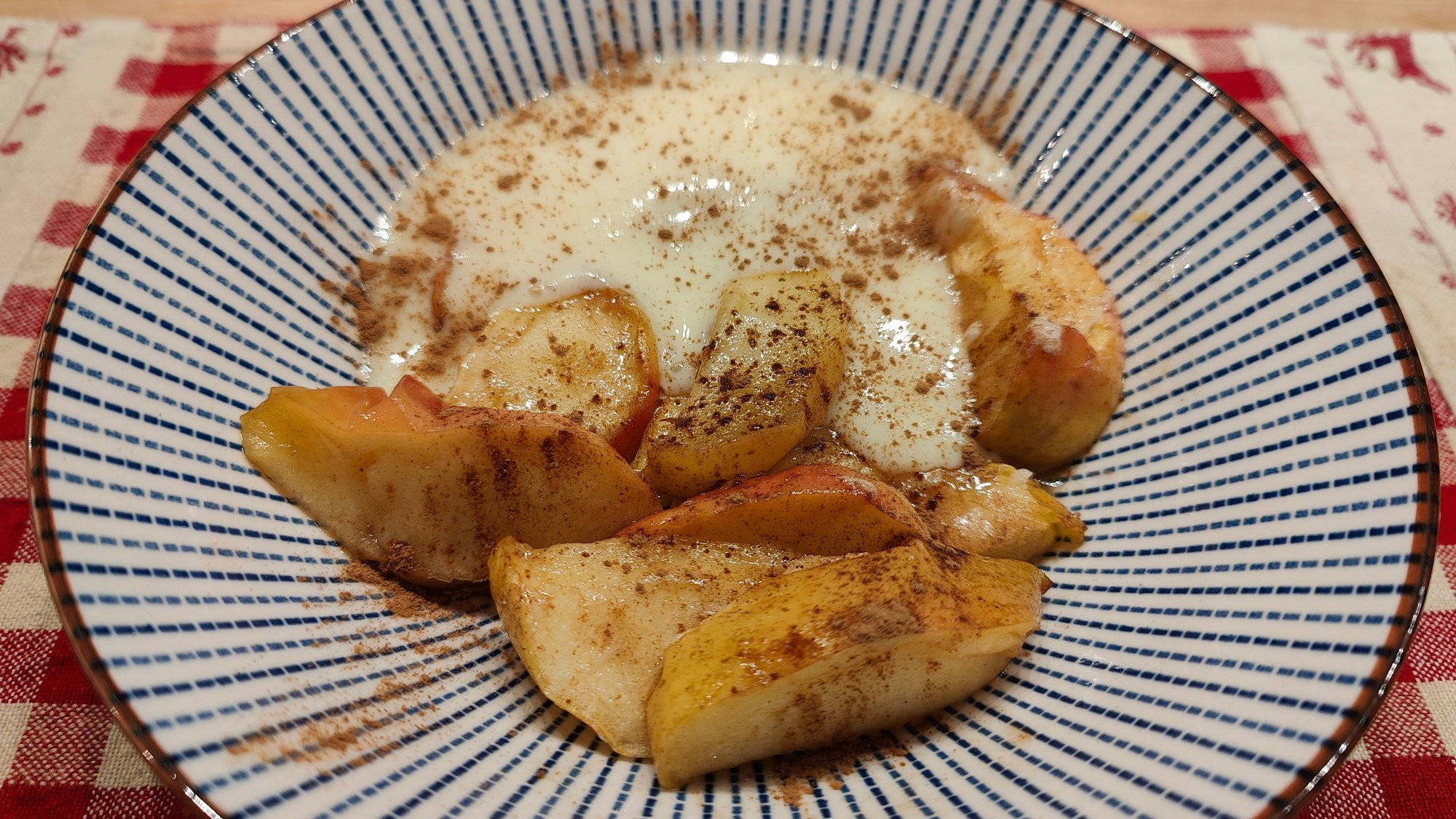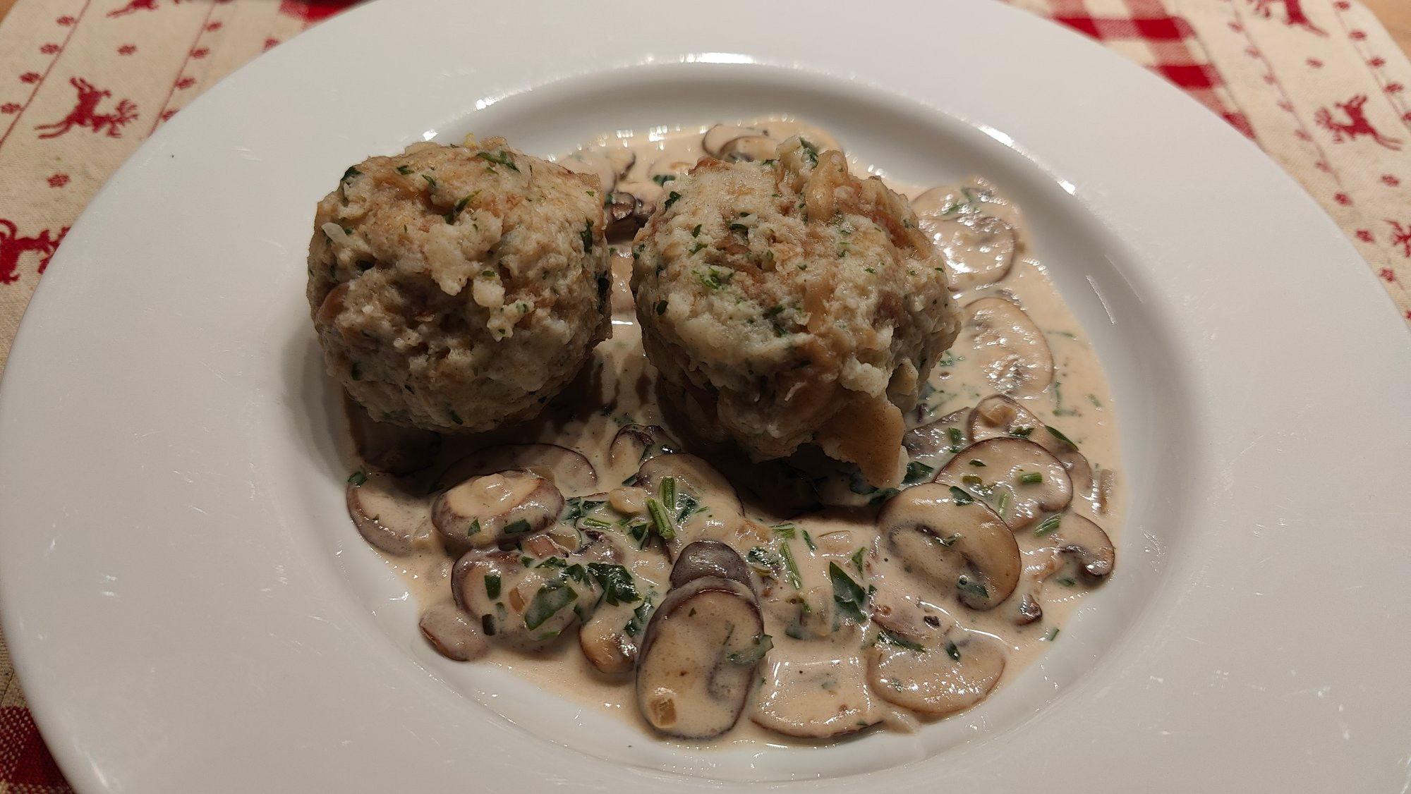 Die letzten Semmelknödel aus dem TK und Schwammerlsauce. Als Nachspeise Äpfel aus dem Airfryer mit Zimt und Vanillesauce.