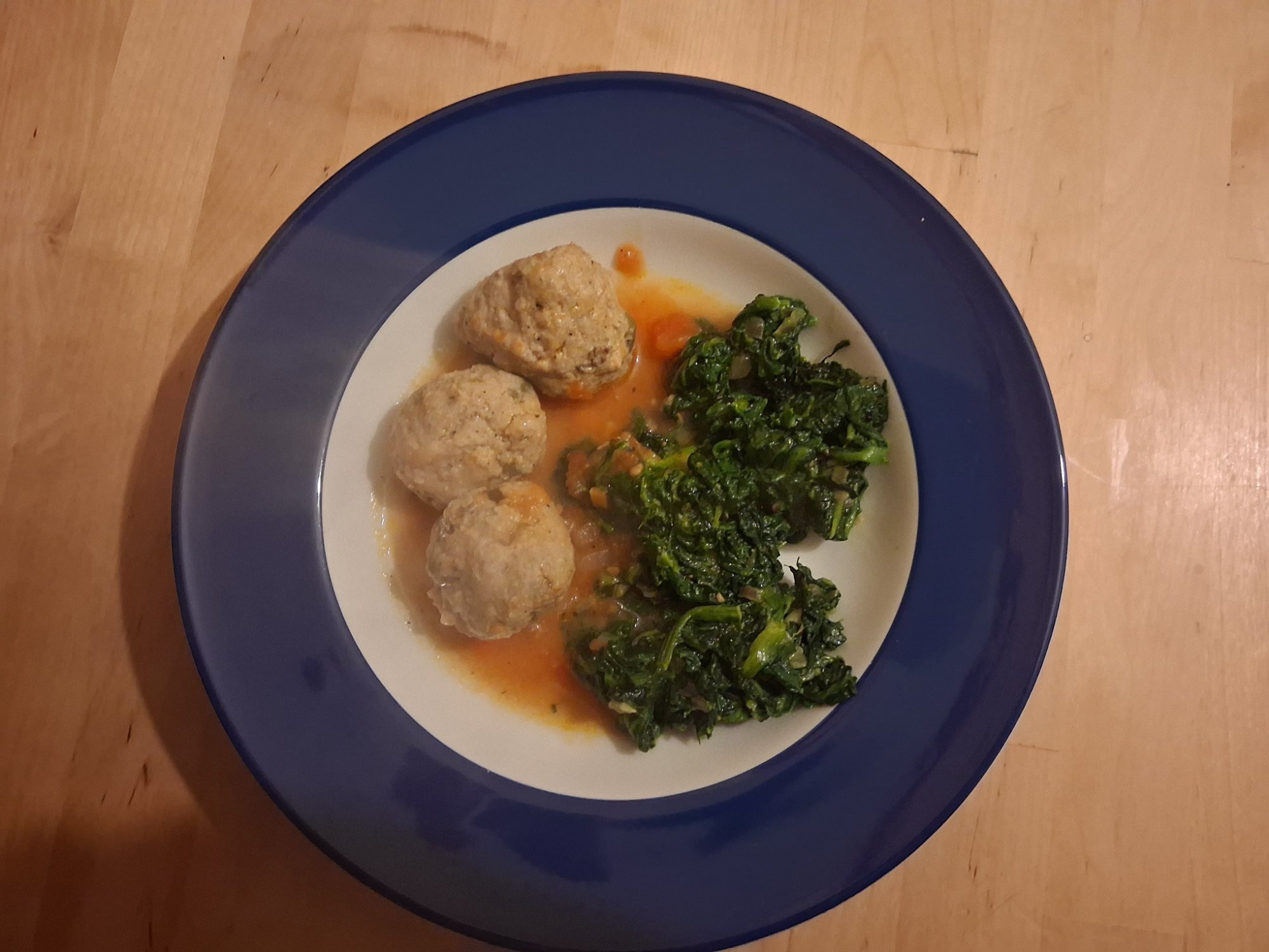 Provenzalische Hackbällchen (Sardellen, Kapern, Limettenschale) in Tomatensauce, dazu Spinat und Baguette und einen grauen Burgunder.