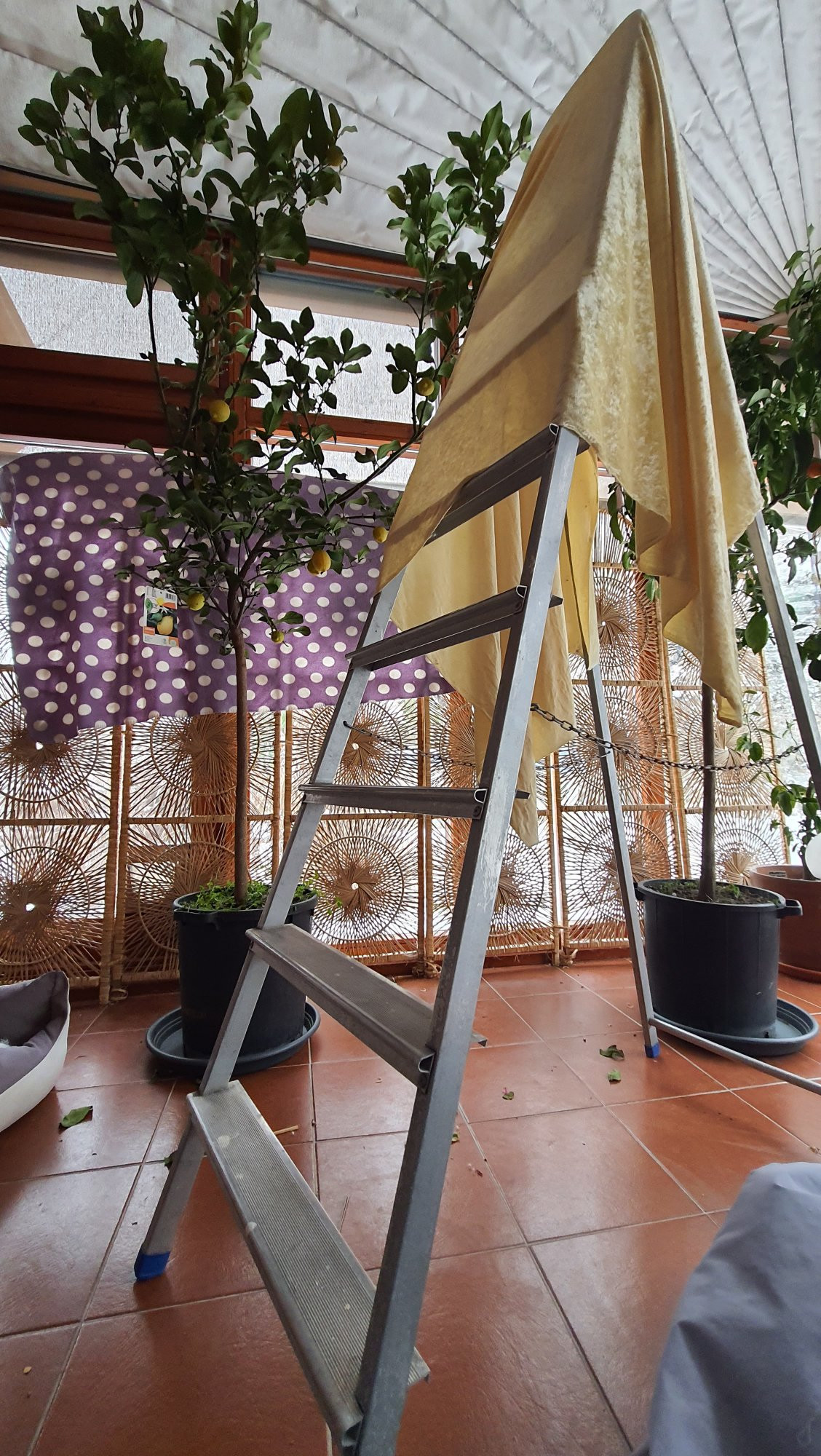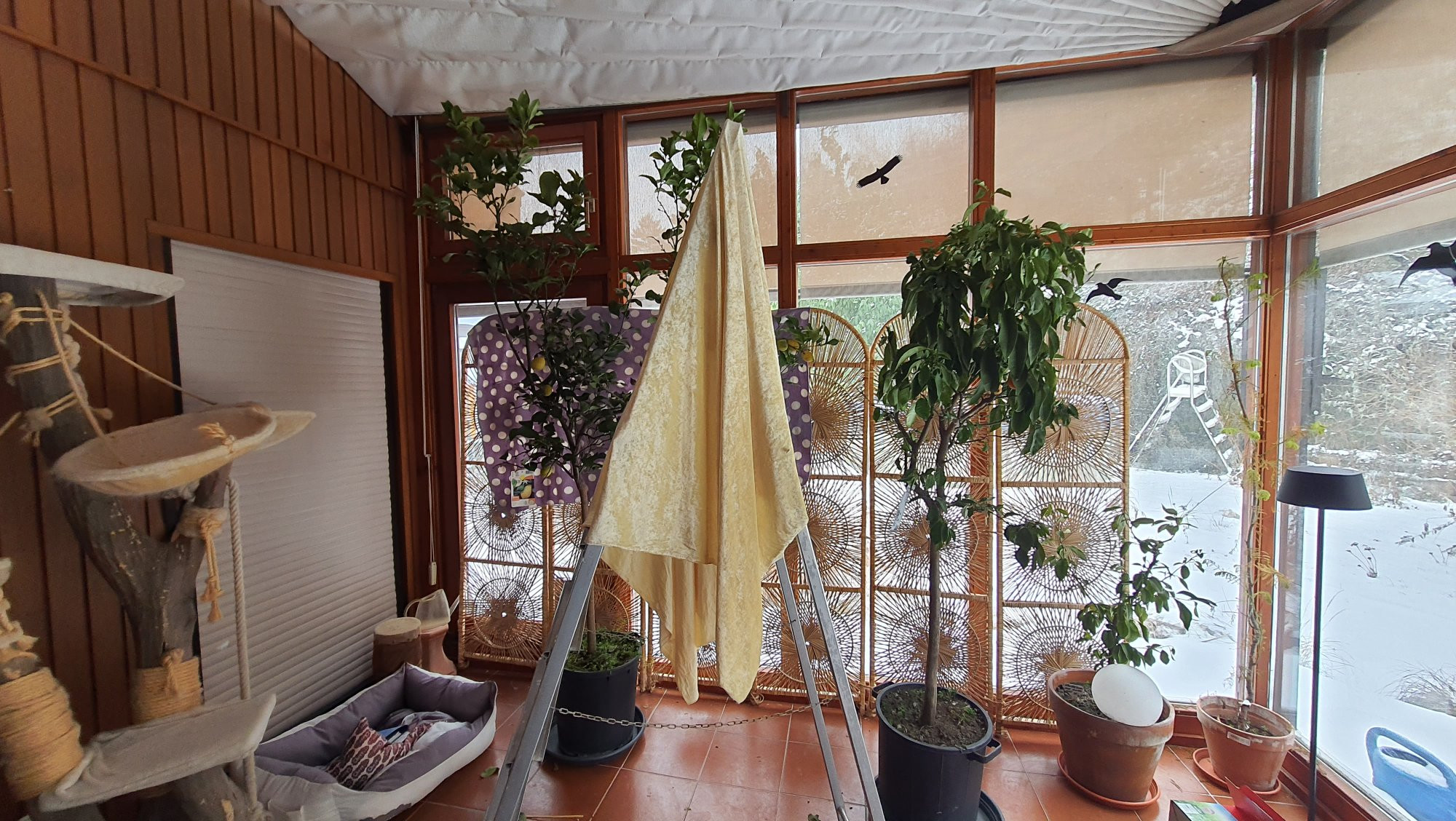 Habe versucht den Wintergarten etwas abzudunkeln, aber das geht nur eingeschränkt. Habe das Rollo an der Wintergartendecke zugemacht, Paravents und eine Leiter vor der Zitrone aufgestellt und diese mit Decken abgehängt damit es nicht mehr ganz so hell ist.
