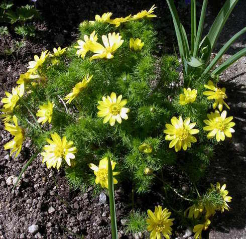 Meine Pflanzen der Adonis Fukujukai (A. multiflora x A. ramosa; syn. Adonis amurensis hort.), obwohl direkt benachbart, zeigen heuer ein eigenartiges Verhalten: der erste Stock ist bereits seit zwei Wochen verblüht, während die beiden anderen erst jetzt in Blüte gehen - trotz oder wegen des milden Winters viel später als sonst. Hier mal einige Impressionen dieser auch laubschönen Pflanze ...