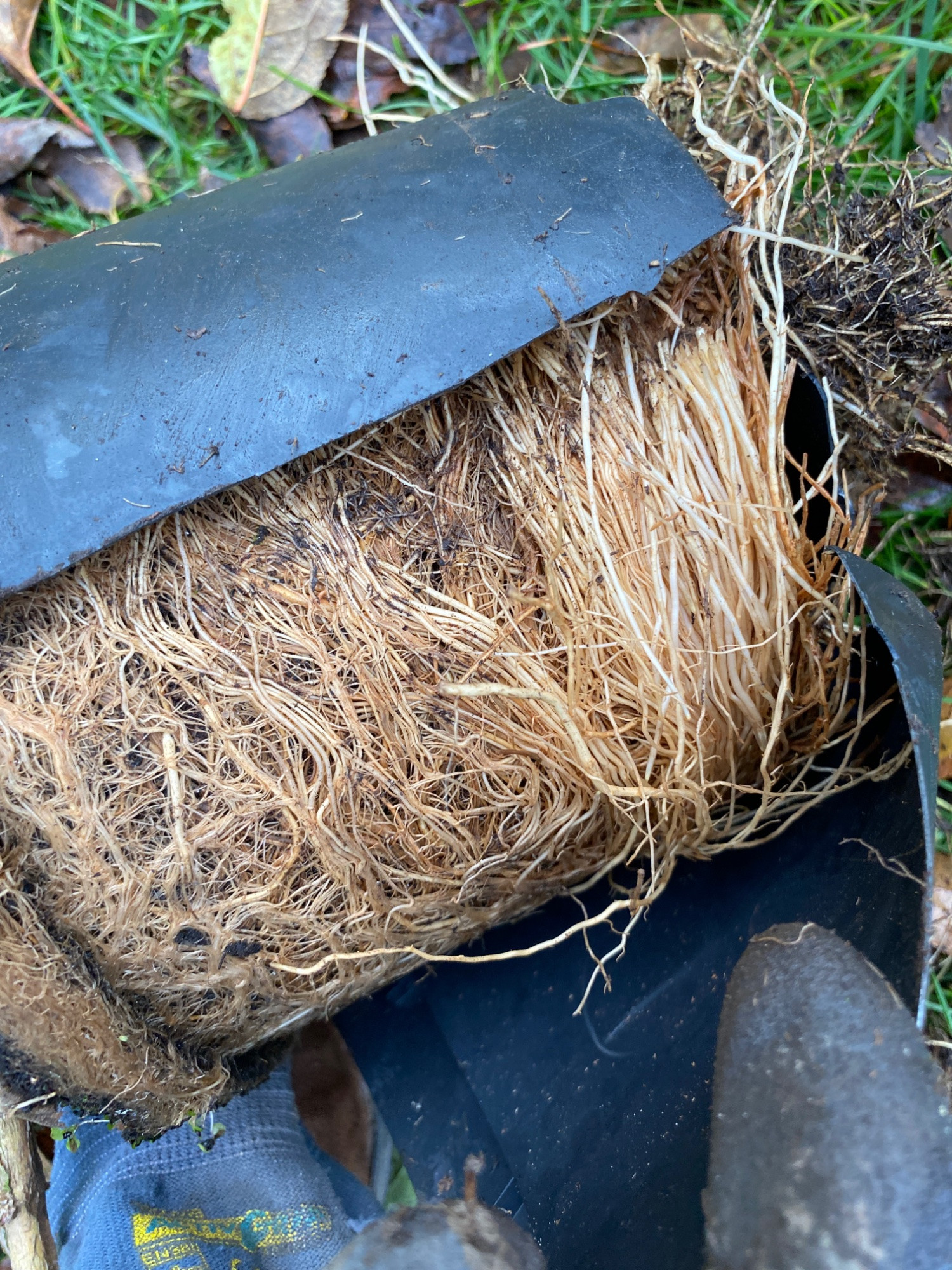 Ich hatte die Wahl zwischen Vorkasse und Rechnung, dacht mir, dass ersteres vielleicht schneller geht, also direkt überwiesen, am Montag wurde der Geldeingang bestätigt, am Dienstag kam die Versandmitteilung, und heute stand schon ein großes Paket vor der Tür, geliefert von GLS, am vereinbarten Ablageort abgestellt, nicht ramponiert und auch richtig herum. Die Töpfe waren jeweils in eine Tüte gepackt, damit die Erde nicht herausfallen kann, oben zugeknotet und unten mit einer Lage Zeitungspapier versehen, und vor dem Verpacken offenbar noch einmal gut gewässert, obwohl zu dieser Jahreszeit das Laub ja schon gefallen ist.