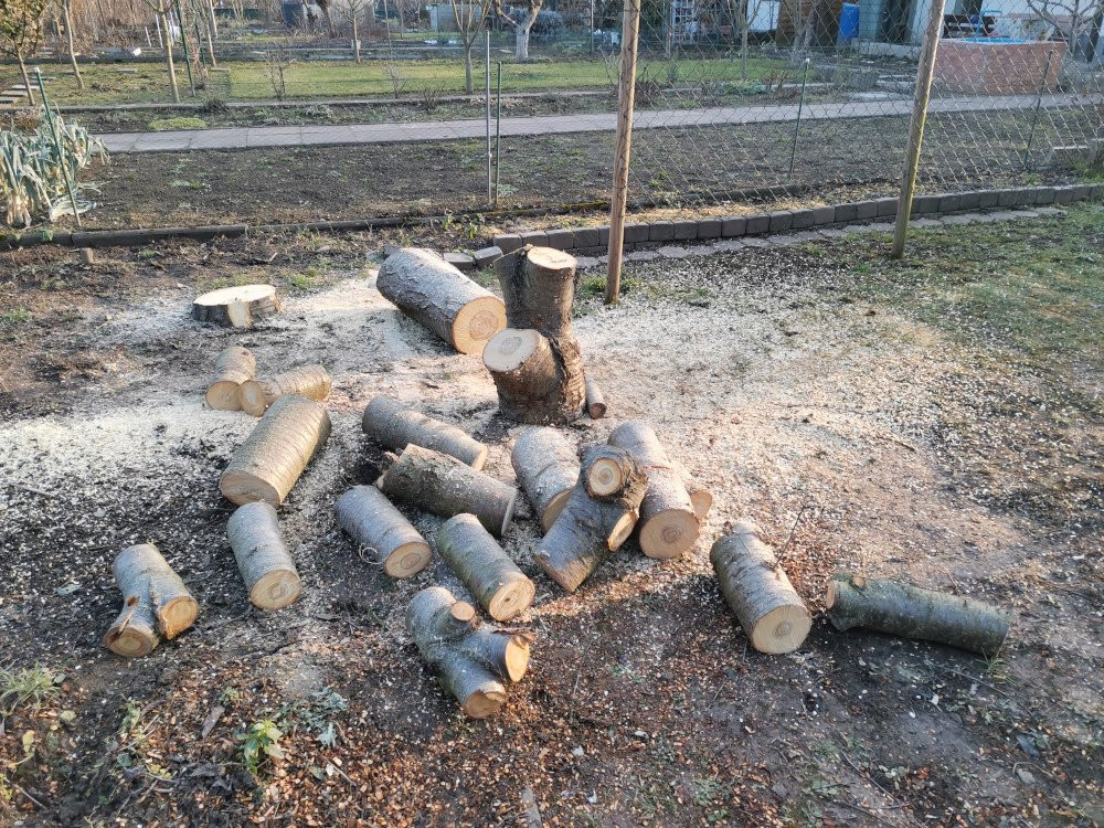 Morsches Holz an der Stammbasis und üppiger Efeubewuchs in der Krone hatten ihn so weit niedergedrückt, dass ich fast nicht mehr an den Kompost kam. Der Stamm war schnell zerlegt, aufwändiger war das Häckseln der sparrigen Zweige und der Efeuranken, drei volle Behälter mit Häckselgut sind nun auf dem Kompost gelandet, die Stammstücke handlich abgelängt am Gartenhaus aufgestapelt und die dickeren Zweige haben noch den Kübel mit Holzhäcksel für Wegebelag u. ä. wieder aufgefüllt.