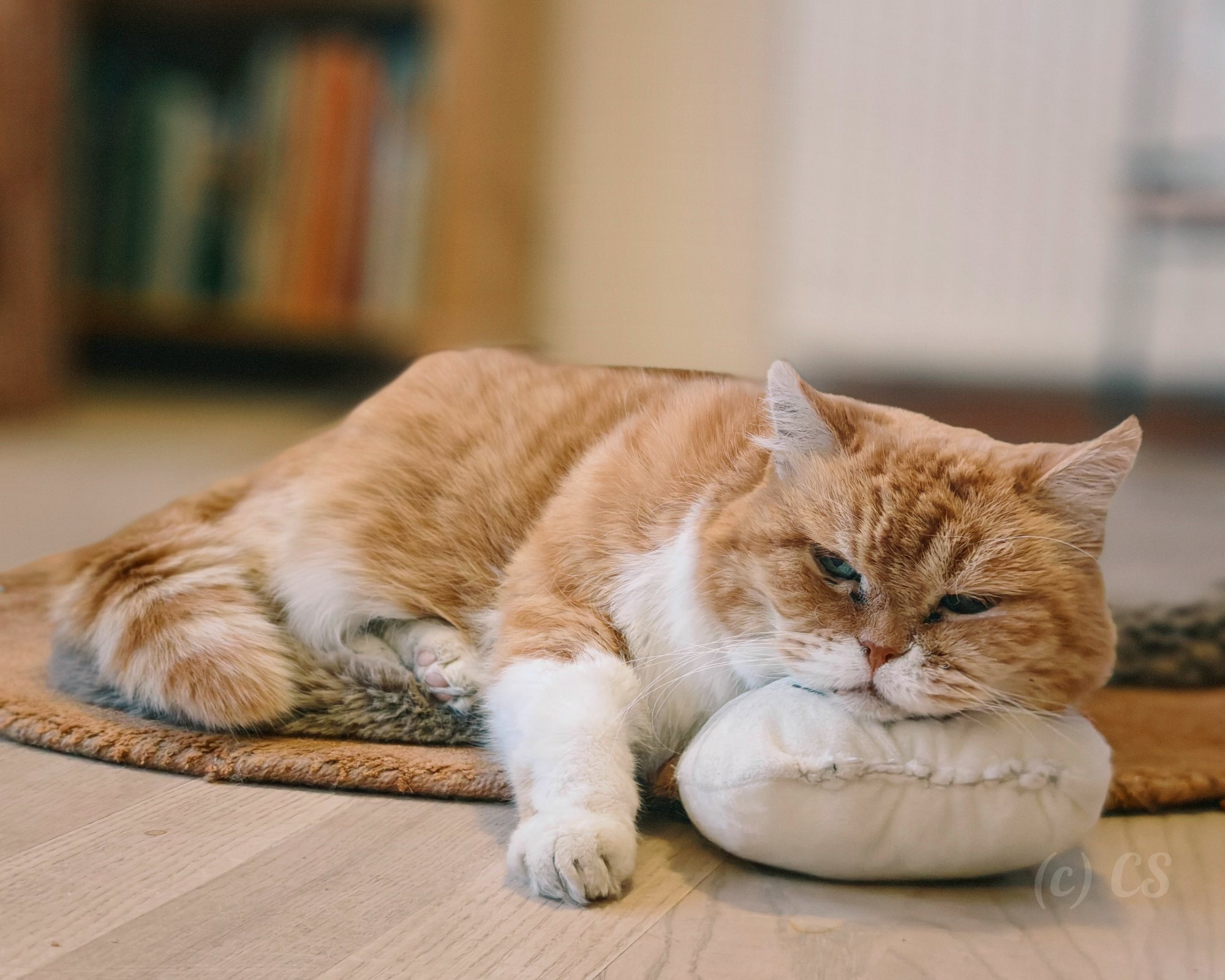Draußen grau, windig, 1 Grad, Omi ist arg müde und schläft auf dem geliebten Teppich. Ich habe ihr das Kissen "Köpfchen" untergeschoben...