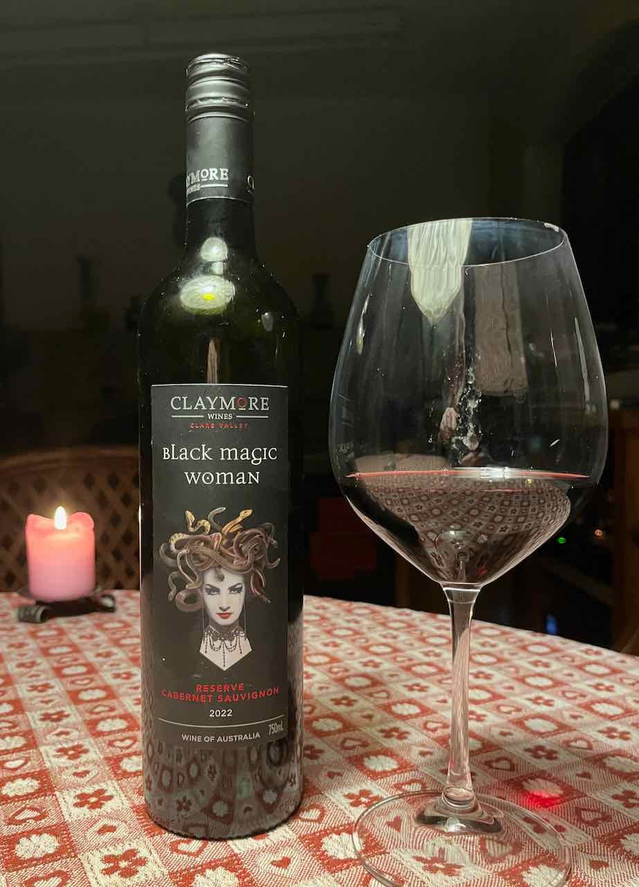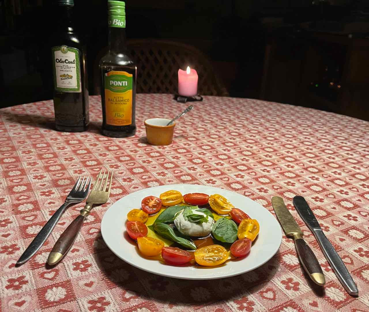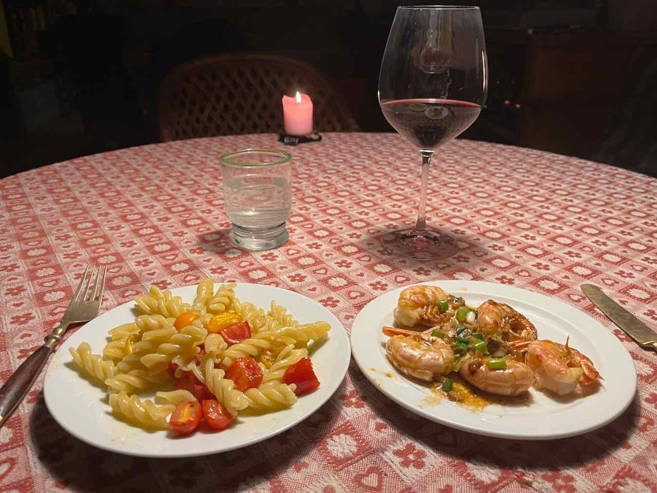 Vorspeise Insalata Caprese mit Büffel-Mozzarella und zweifarbigen Kirschtomaten, Hauptgerichte argentinische Rotgarnelen mit Schale, gebraten mit Koblauch, Frühlingszwiebeln, Reisessig, Agavendicksaft, Soja- und Austernsoße und Sambal Oleg sowie Fusilloni aglio e olio mit Tomatenstückchen zum Cabernet Sauvignon 2022 "Black magig woman" aus Australien