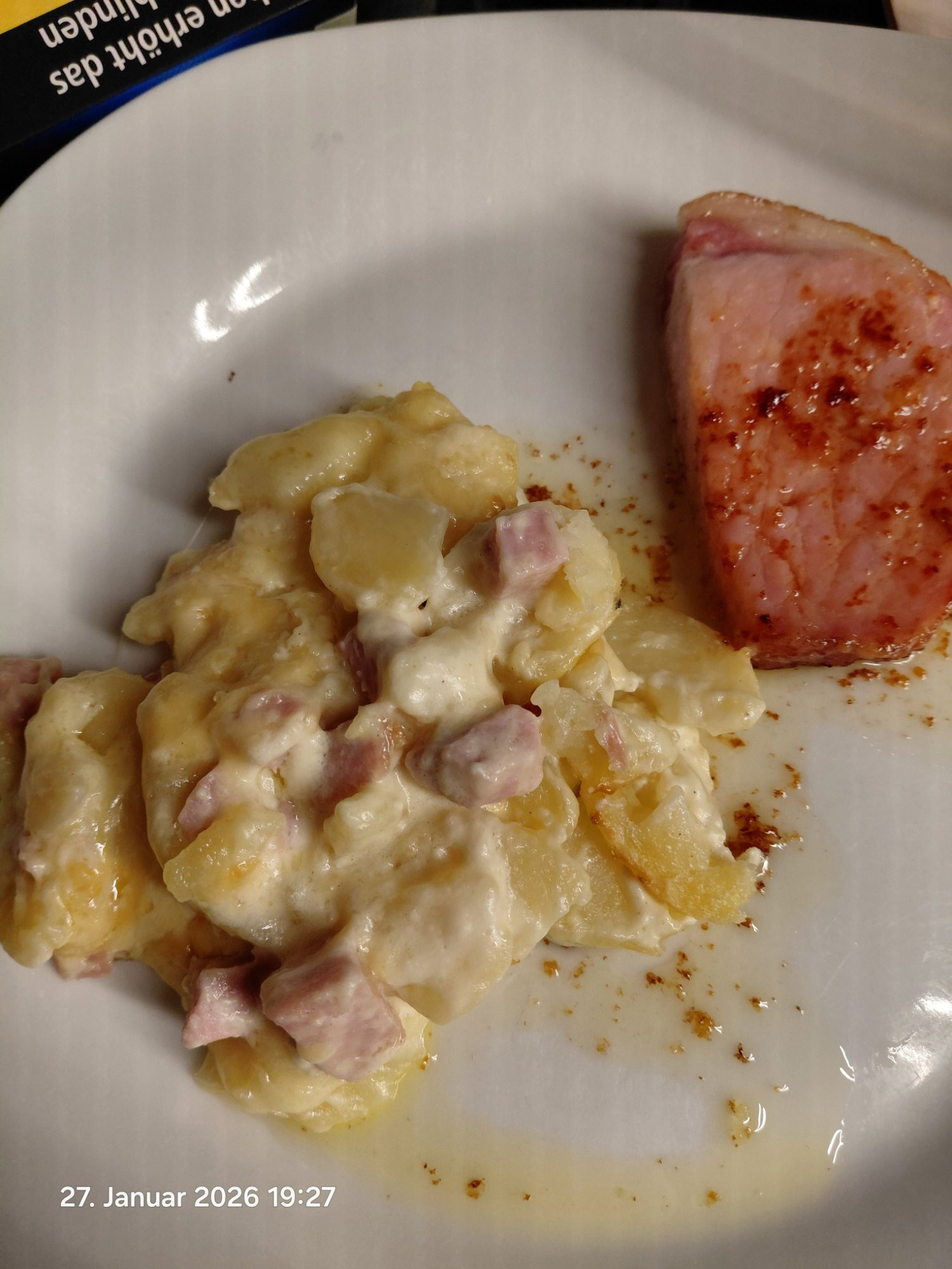Kartoffelgratin, mit Bergkäse überbacken und. Kasseler Rücken in Butter gebratenen, yammie