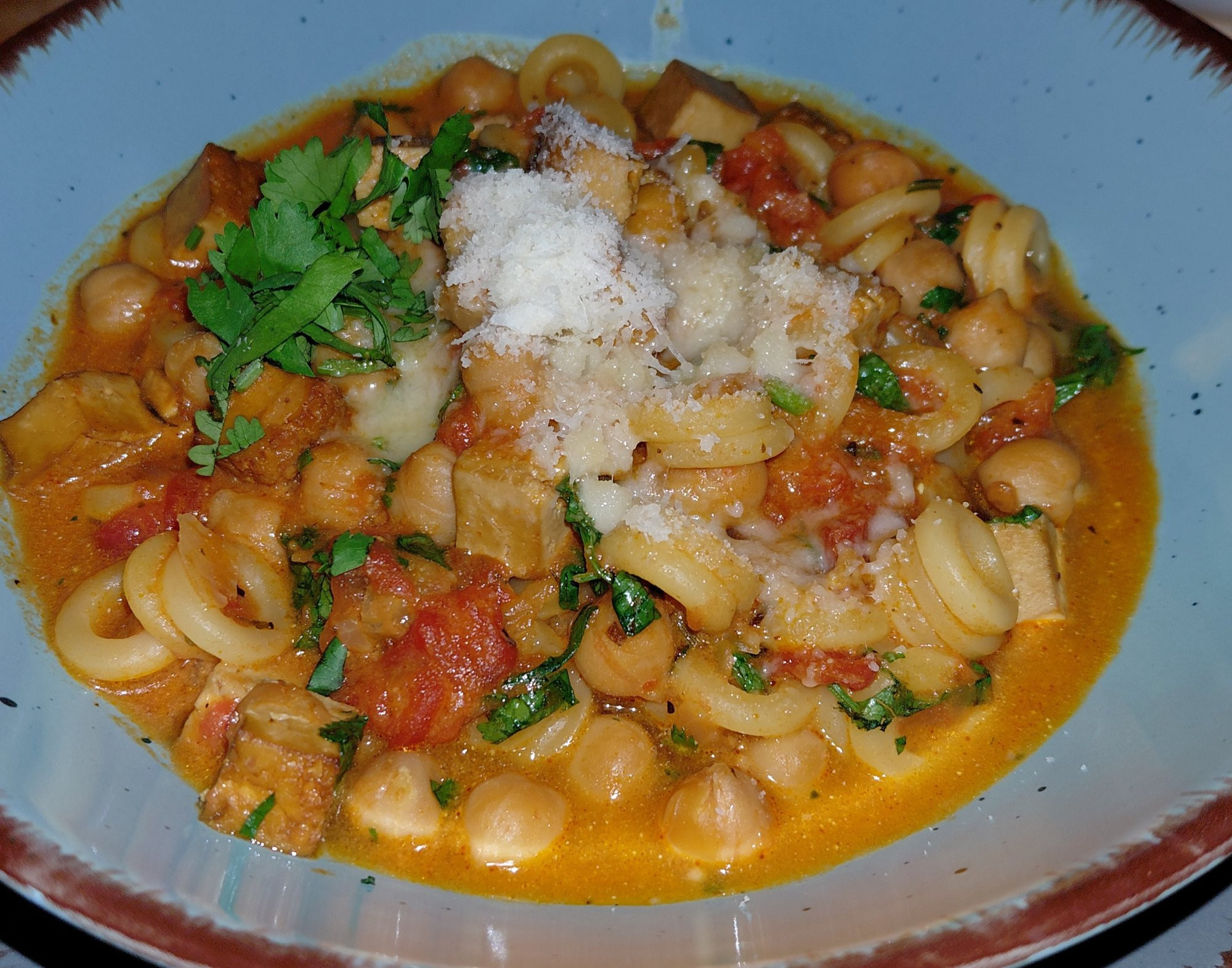 Eintopf mit Tomaten, Nudeln, Kichererbsen und Parmesan