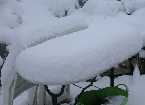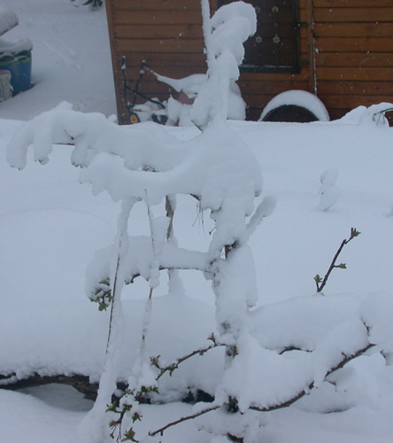 . Die Narzissen mit den "langen Hälsen" von gestern sind jetzt komplett im Schnee versunken. Noch schlimmer hat es die Osthessen getroffen, dort musste das rote Kreuz heute Nacht Leute mit Decken und heissen Getränken in einem 30km langen Stau im Schneetreiben versorgen. Ausserdem sind viele Bäume unter der Schneelast zusammengebrochen. Männe macht heute home office day, da braucht er sich nicht in das Chaos wagen