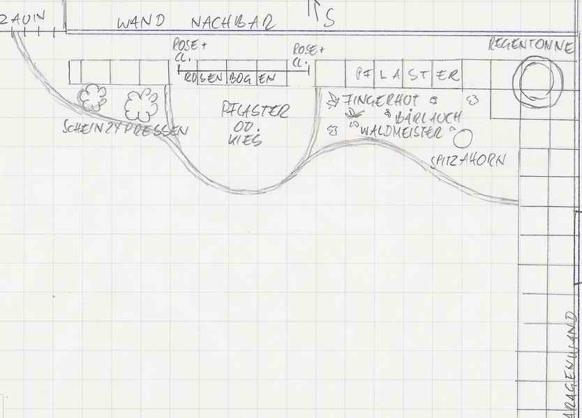 Bin zwar keine Garten-Design-Spezialistin, aber ich habe noch ein paar Fragen zu Deinem Plan.Wo steht das Haus? Wie gross ist der "Pflaster - Kies" - Platz etwa?Was ist das für eine geschwungene Linie, ist das eine Abgrenzung gegen was und aus was, oder ist das nur gezeichnet und ist dahinter ein Garten, Wiese oder was?Wie hoch ist die Wand vom Nachbar?Wie breit ist der Rosenbogen?Kommst Du in das Plätzchen unter dem Rosenbogen durch oder lieber seitlich zum Plätzchen?Der Zaun, Maschendraht, Holz oder wie und wie hoch?Hat es sonst noch Bäume in der Nähe?Mach doch mal ein Foto von dem ganzen Stück.
