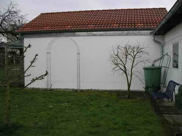 Liebe KarinIst Dein Sinn eher nach:Sträucher? Felsenbirne, Magnolie, Schneeball, Cornus, oder noch andere Rosen? Das ist nur eine kleine Auswahl.Rankgitter auf der Seite? Kletterhilfe an des Nachbars Mauer für Bepflanzung, damit die Mauer nicht so die Hitze abstrahlt. An Deine Garagenwand kannst Du ja hin machen was Du willst, ohne zu fragen oder? Oder Du stellst Pfosten auf, gegenüber Deiner Wand, ziehst Drähte die Du an der Garagenwand befestigst, Kiwi, Rosen, Lonicera, Clematis. Die könntest die beiden Wände begrünen. Wahrscheinlich wird das sicher sehr heiss dort, also ein richtiger Hitzestau im Sommer. Die Hitze strahlt von zwei weissen Mauern ab.Unter dem Rosenbogen zu sitzen, ist schon sehr eng, ich meine der Tiefe wegen. Also da geben die Rosen am Bogen nicht sehr viel Schatten her.Eine andere Variante: Ich habe jetzt mal ein Viereck gezeichnet. Also so eine Art Pergola, aber das ist wahrscheinlich zu massiv? Darüber könntest Du noch mehr Kletterrosen, Clematis, Lonicera ziehen, oder wilden Wein der auch gut schattiert, wachsen lassen. Den Eingang habe ich seitlich gezeichnet, mit diagonal verlaufenden Schrittplatten. Dazu dem geschwungenen Plattenverlauf folgend links ein längliches Beet.Wahrscheinlich würden mich die Scheinzypressen stören, an deren Stelle gäbe es herrliche Sträucher oder Rosen. Es würde immer was blühen.Die Frage ist, wohin willst Du schauen? Man kann den Eingang oder links seitliche machen, mit ein paar Schrittplatten. Links ist die Morgensonne. Was hast Du denn sonst noch für Blickpunkte im Garten? Unter dem Rosenbogen sitzend, schaust Du da direkt auf das Haus?Kommt der Weg der Wand entlang vom Haus aus? Ich mach mal ein paar Varianten, aber es braucht ein bischen Zeit. Ich kann im Moment sowieso nichts im Garten machen, da alles unter einer dicken Schneeschicht begraben liegt.