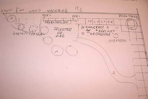 Hallo Marcir,Foto geht grad nicht, ist alles eingeschneit, vielleicht morgen.Die Zeichnung zeigt meine südliche Grundstückgrenze (im Bild oben), im Westen meine Garage (im Bild rechts), im Süden die Garage des Nachbarn auf meiner Grundstücksgrenze, 2,60 m hoch + Dachschräge (ich schau genau auf Dach).Der geplante Pflaster/Kiesplatz ist 2 m breit und ca. 1,60 m tief, es soll nur für ein oder zwei Stühle und ein kleines Tischchen sein.Die geschwungene Linie ist nur eingezeichent und die geplante Linie zur Bepflanzung / Sitzplatz, jetzt ist da Wiese.Der Rosenbogen ist 1,50 m breit und 2,50 m hoch, 40 cm von der Wand entfernt, also ich kann direkt unter dem Bogen sitzen, nur von vorne begehbar.Der Zaun ist 1,25 hoch und besteht aus Doppelstabmatten verzinkt. Genau am am unteren Bildende links beginnt die Terasse, dort steht eine Korkenzieher-Robinie, nicht sehr hoch und kleine Krone.Wie gesagt, im gezeichneten Plan steht bis jetzt nur der Rosenbogen (links und rechts eine Clematis, bereits mehrere Jahre alt, und je eine Rose bestellt aber noch nicht gepflanzt), die eingezeichnete Pflasterreihe entlang der Wände und der Spitzahorn, ca 6 Jahre alt. Alles andere ist Planung.Gruß Karin