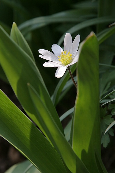 diese kleine Anemone hat sich schon längst entfaltet und schiebt sich wacker neben dem üppigen Tulpenlaub zum Licht hin