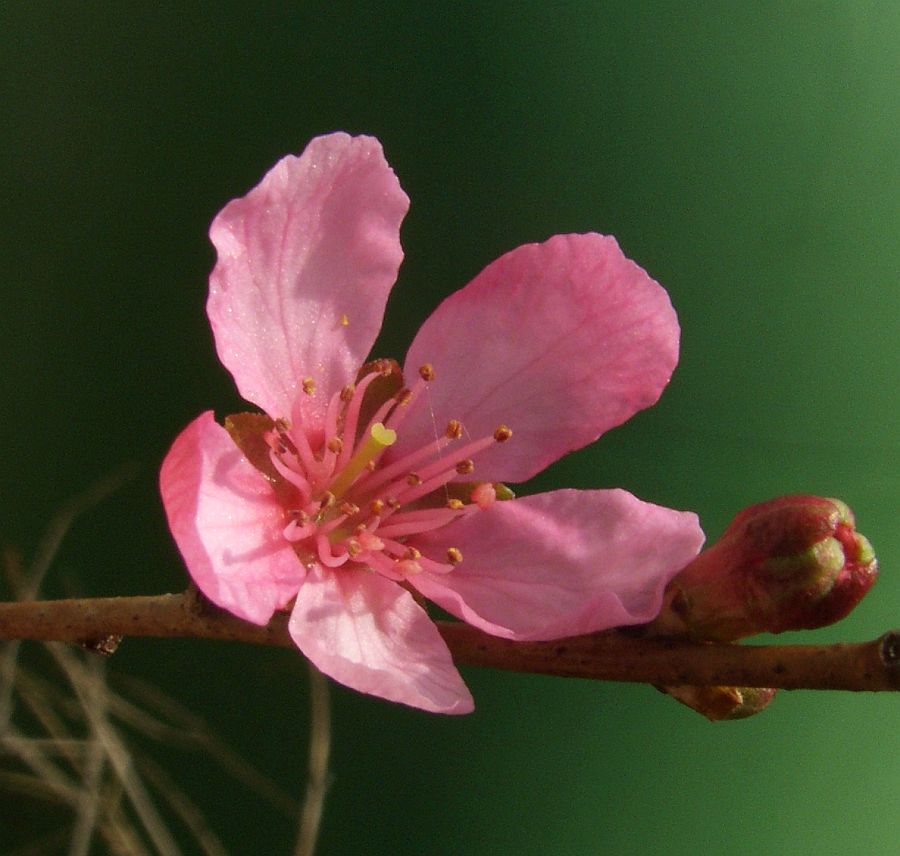 Zwei Blütenbilder von Gehölzen der Kirschengattung: Prunus tenella Firehill, die Zwergmandel, ...
